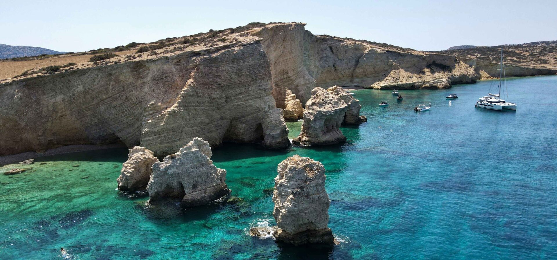 Milos is an island like no other. Shaped by volcanic activity, its coastline is dotted with surreal rock formations, mineral-coloured cliffs, and secret caves. The highlight? Kleftiko, a former pirate hideout only reachable by boat. Dive into its turquoise waters, swim through sea caves, and marvel at towering white cliffs. For a quieter anchorage, head to Gerakas, a stunning, sheltered cove with soft sands and thermal springs nearby.