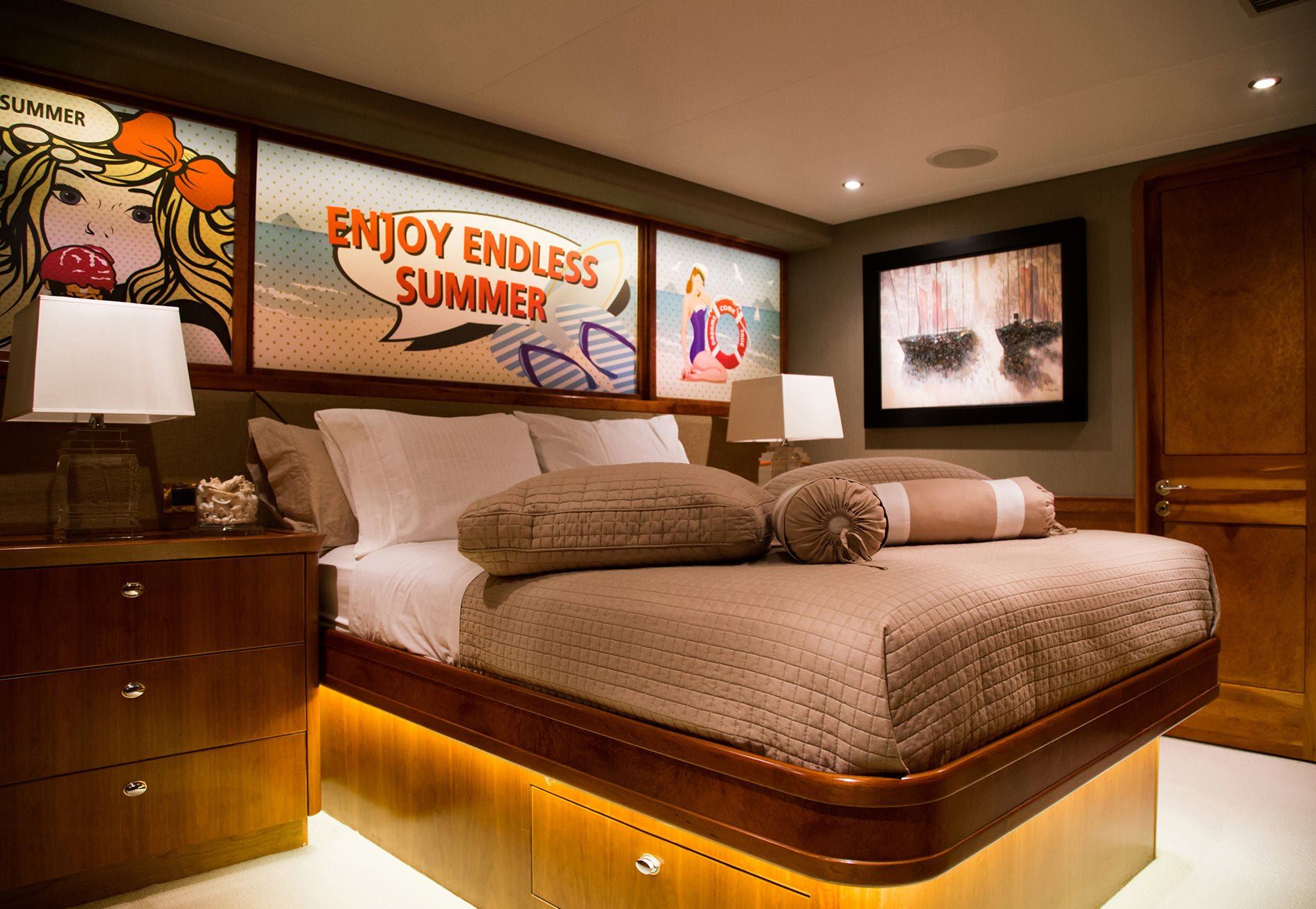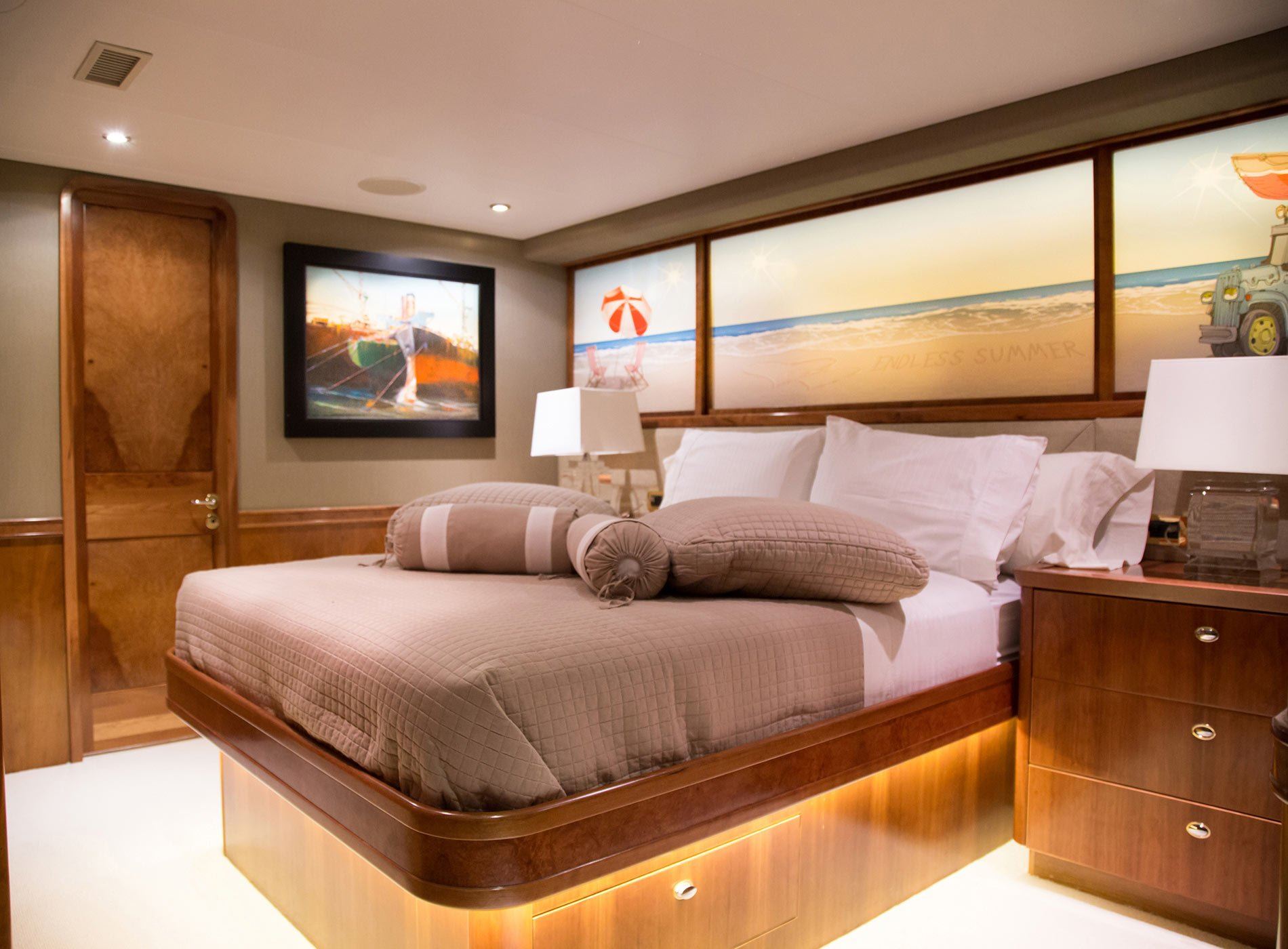 ENDLESS SUMMER’s main salon and dining room are located in the main deck and enjoy state of the art entertainment center with 42″ plasma TV, iPod base for distribution of your favourite music everywhere on the yacht and pronto touch screen controls for all audio-video. A day head is located on this level. Further forward is the Master Stateroom.
