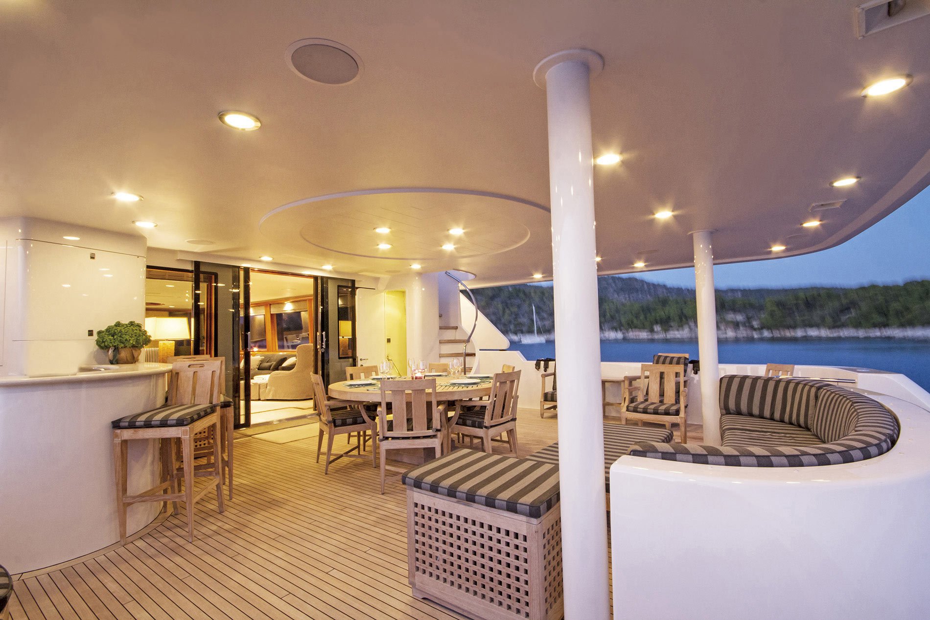 ENDLESS SUMMER has a state of the art entertainment centre with 42″ plasma TV, DVD/CD and karaoke all controlled by pronto touch screen controls. The motor yacht’s sky lounge has access to the pilothouse, as well as to the upper aft deck where lounge seating for casual dining and an 8 person Spa Pool are located.