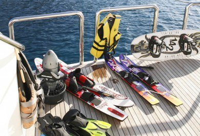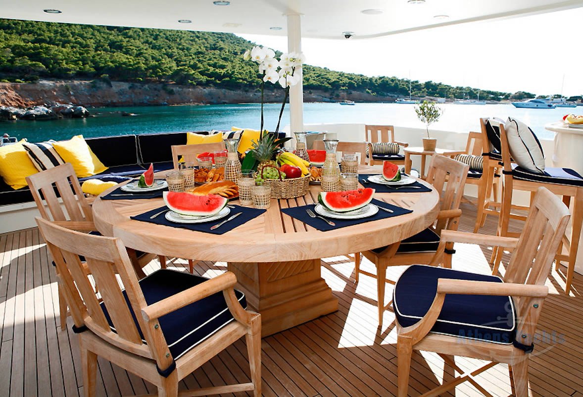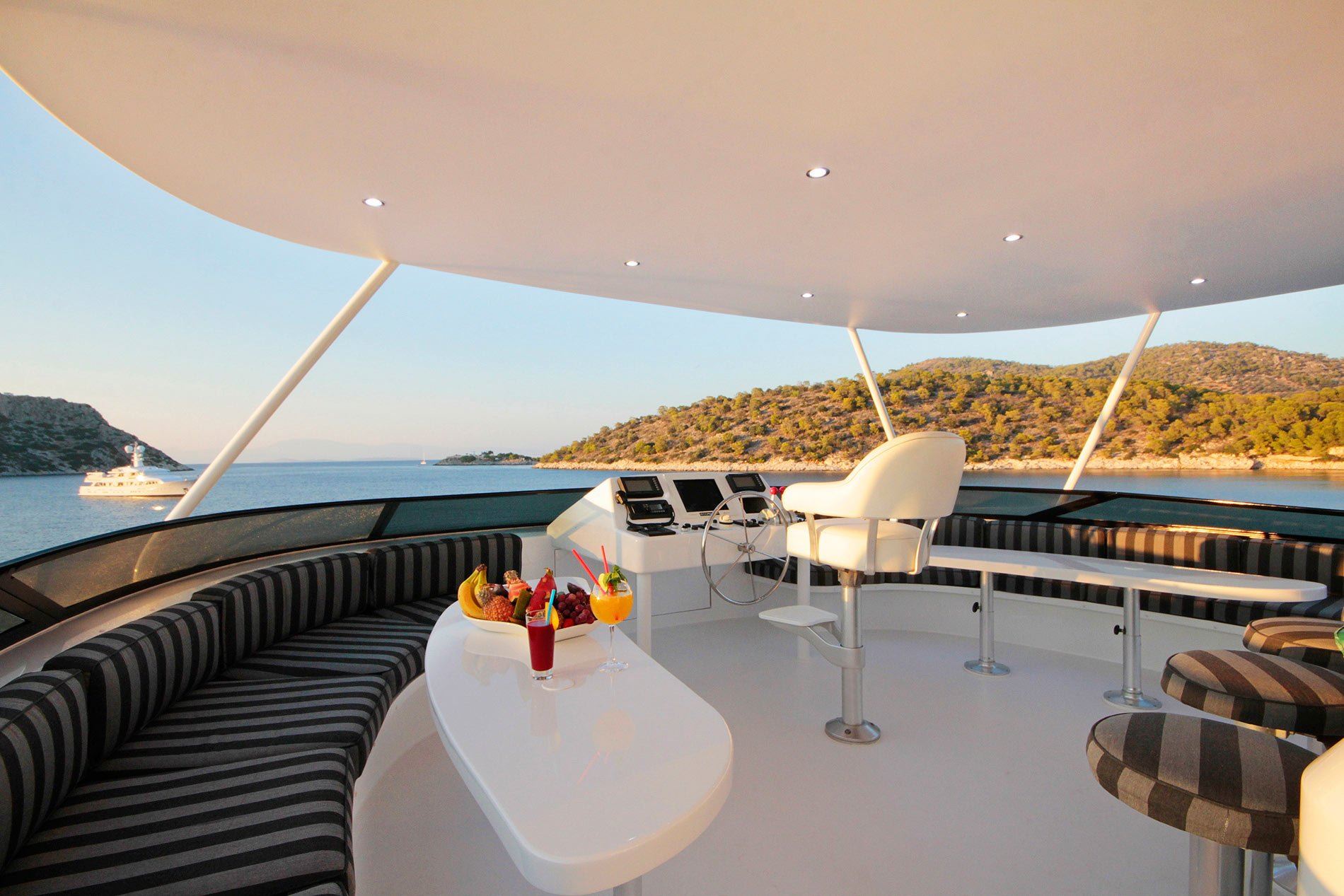 Her fly bridge provides large sun pads, seating for up to 14 people, a hard top and 2 large umbrellas for shade, a wet bar with sink, refrigerator and a large barbeque, 4 bar stools and a pilot station. There is also a fore deck circular seating area, located on the bow, for sun-bathing or just enjoying fresh air.