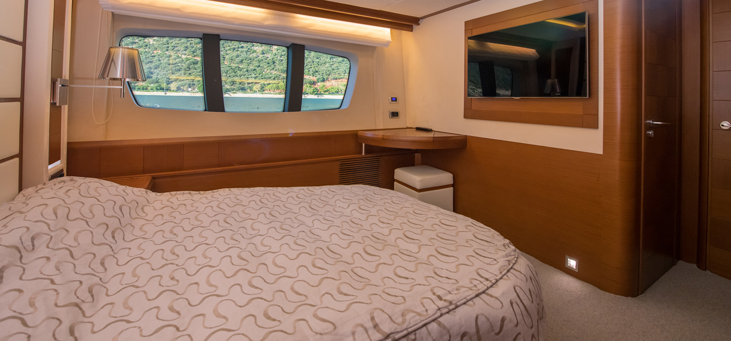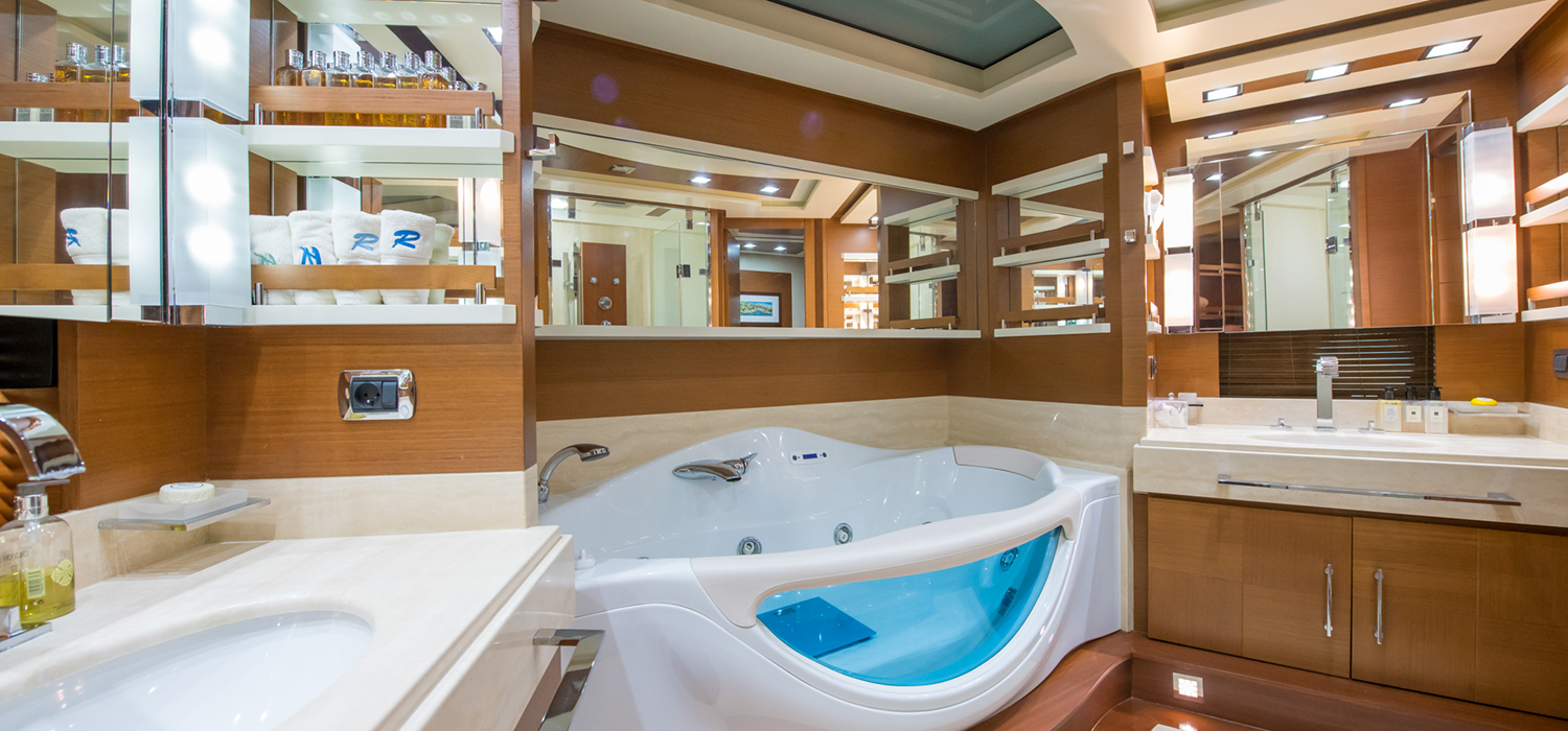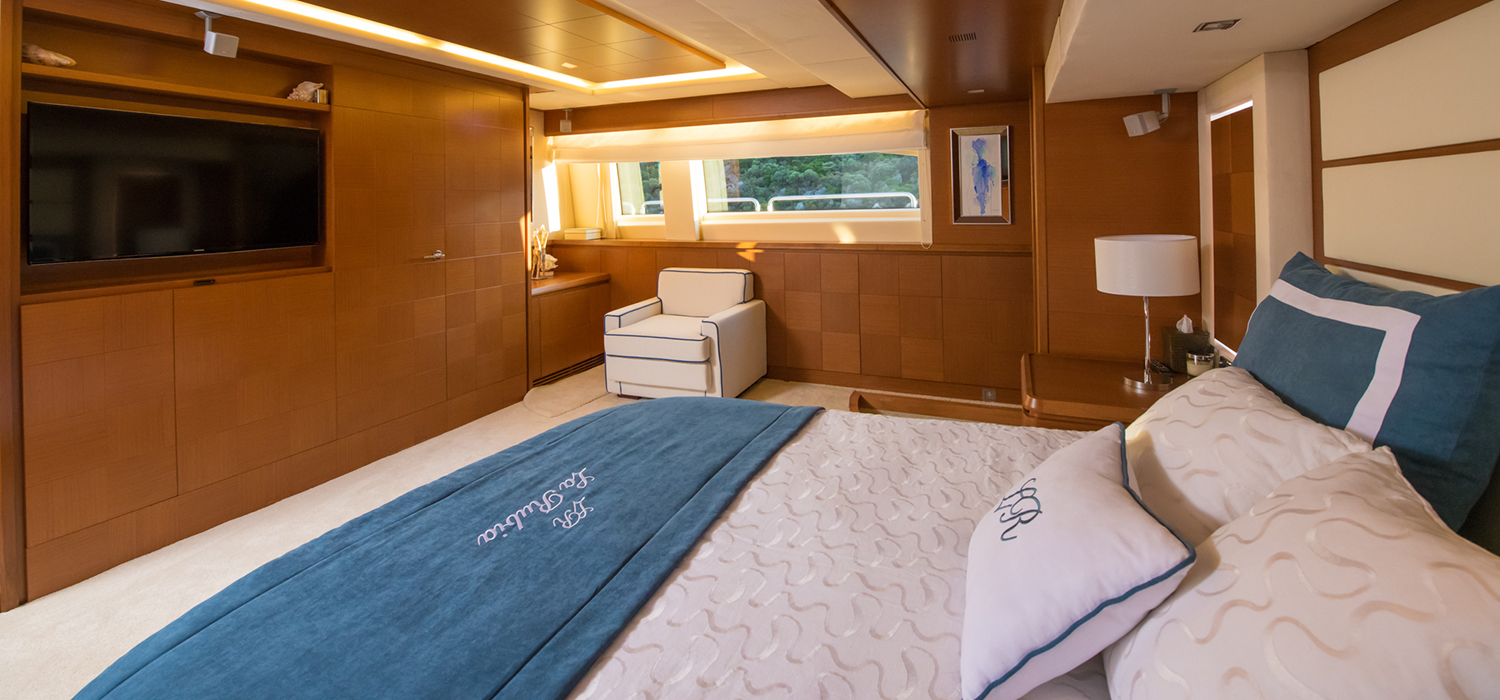 The main deck master suite is a private retreat featuring Armani Casa furnishings, Travertino Navona marble, and a jacuzzi bath – designed for those who expect the same comfort at sea as they do on land.