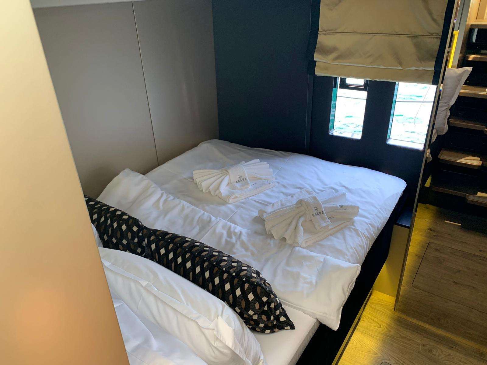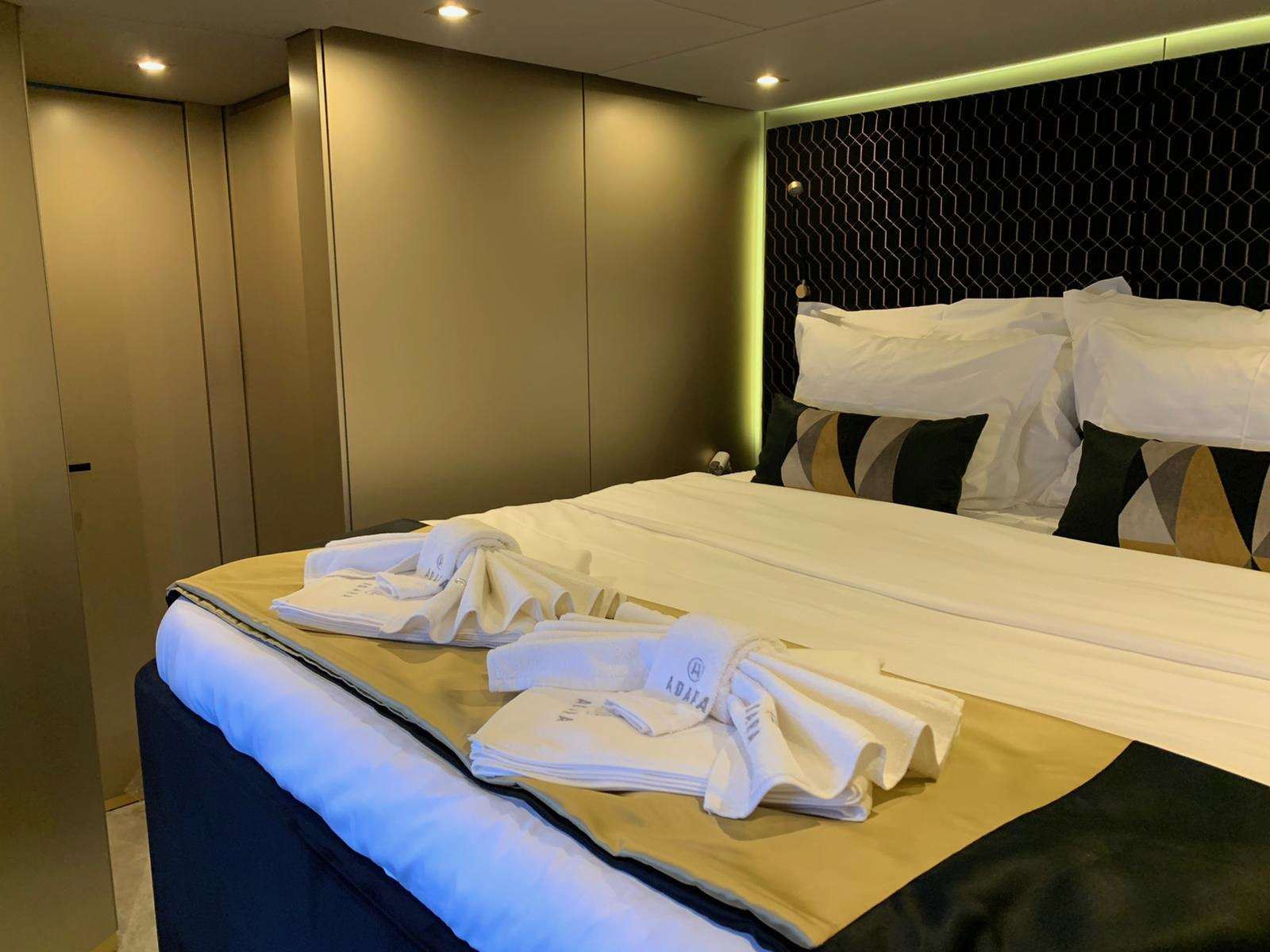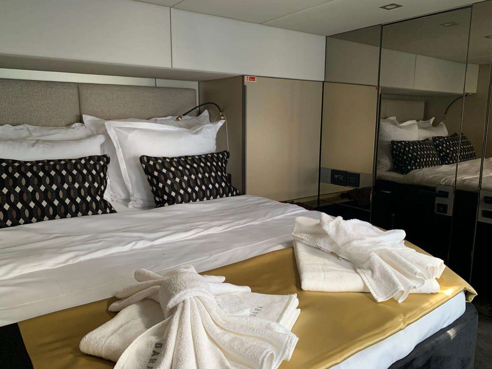 The hulls generously offer expansive spaces, allowing for the creation of a personalised arrangement that encompasses elegant guest cabins suffused with airiness. Additionally, a lavish master suite takes center stage, boasting a walk-in dressing area, desk, a plush sofa, retractable TV, and an expansive bathroom that exudes opulence.