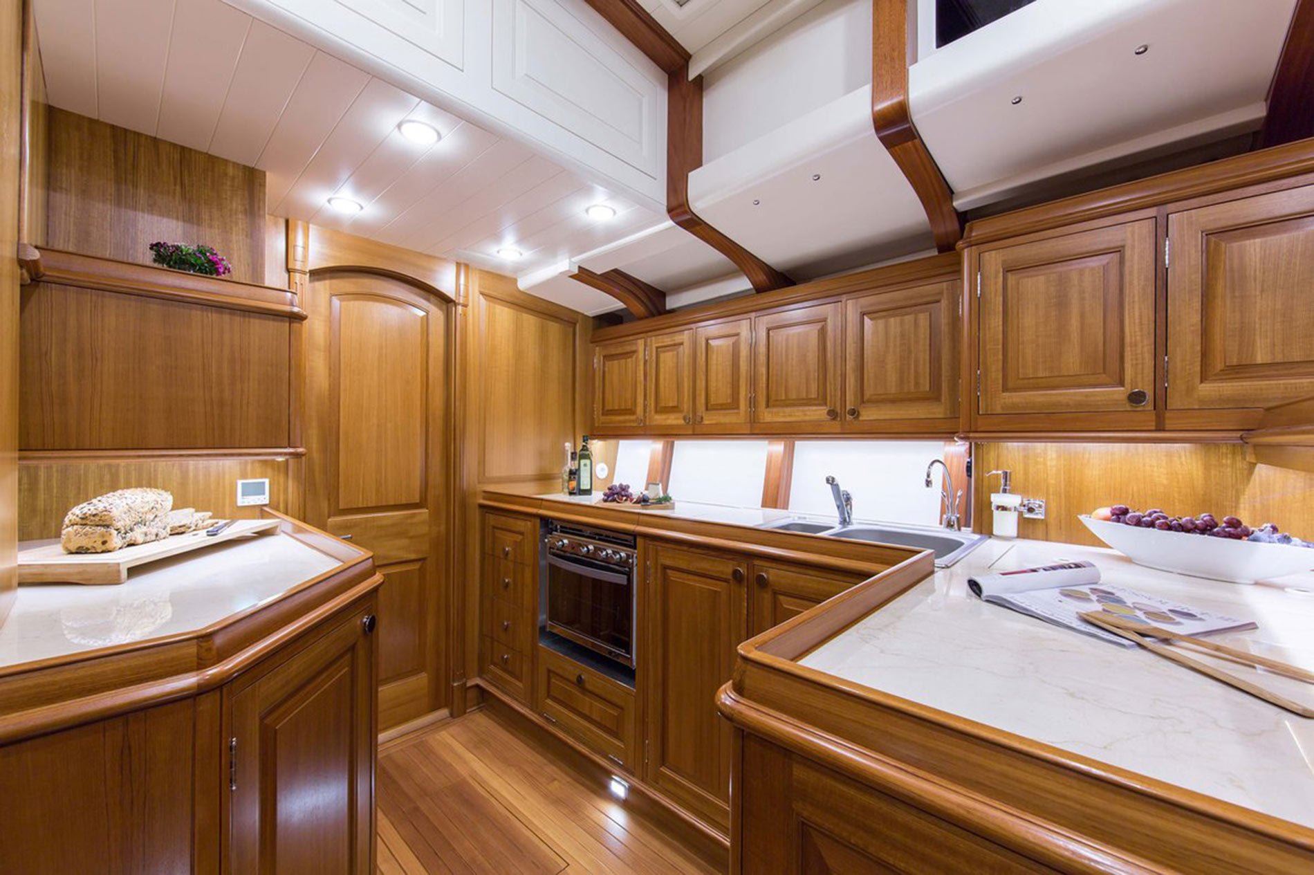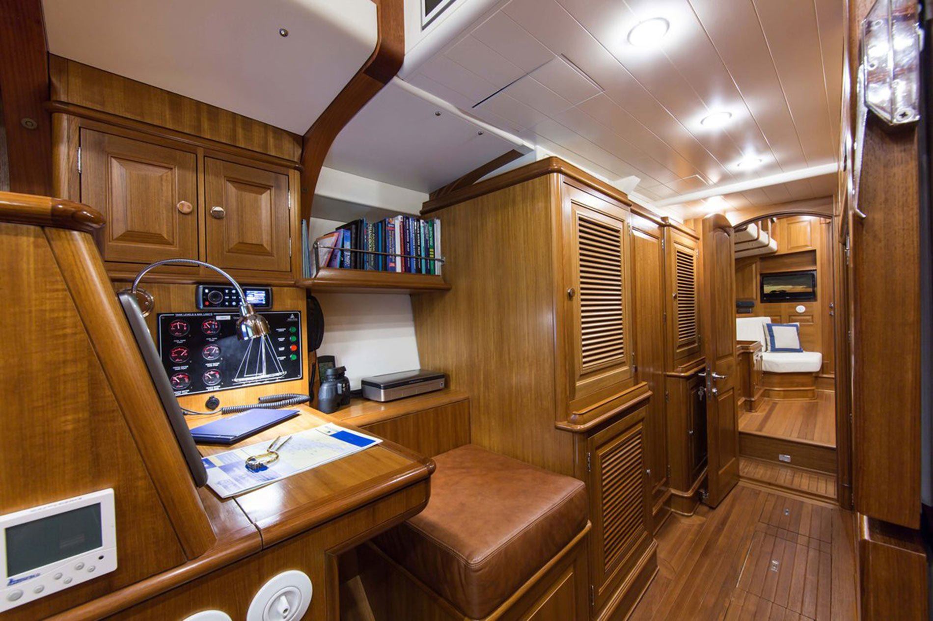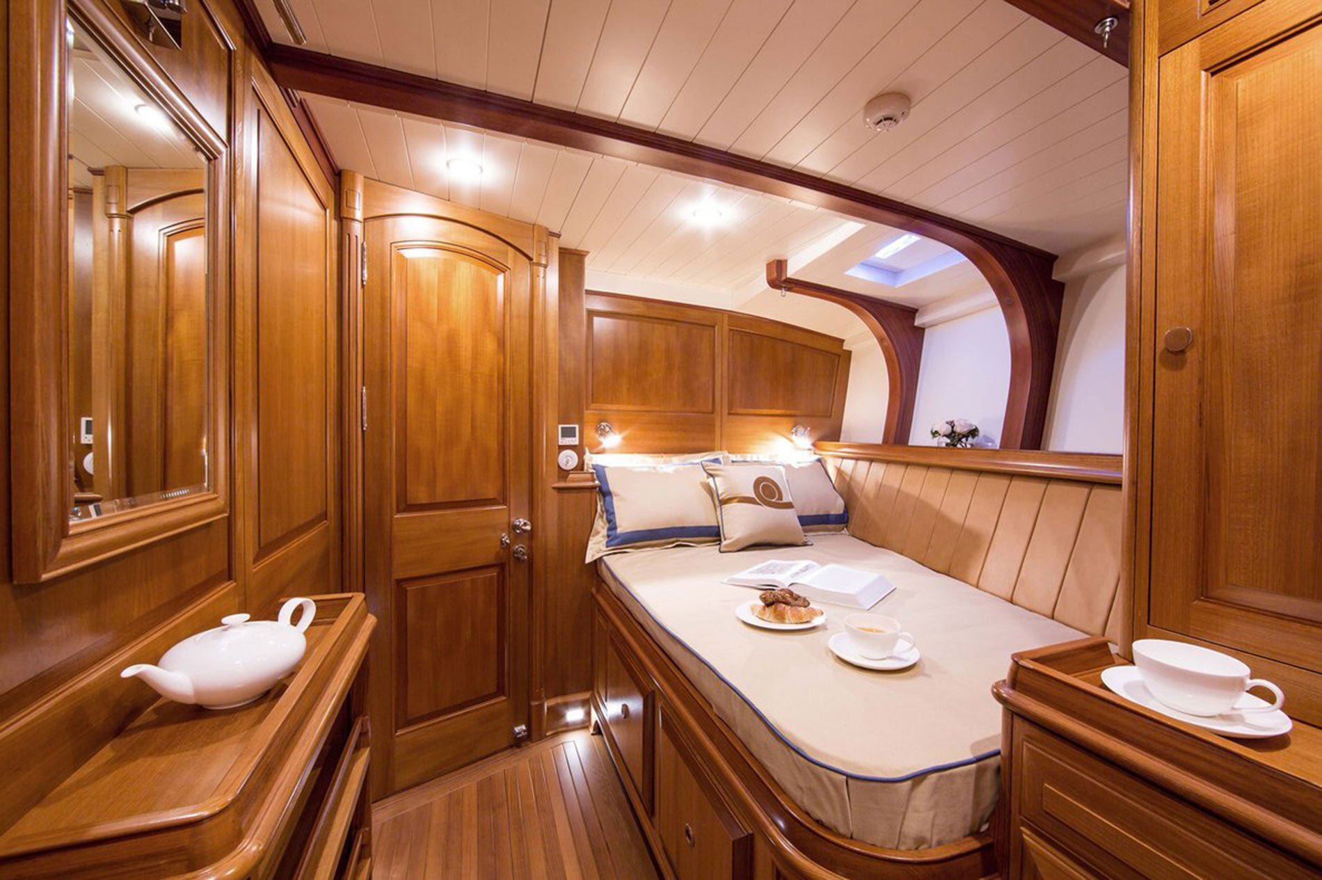 Her cold moulded, wooden construction comprised of Acajou (better known as African mahogany) planking on Acajou frames with five layers of veneer laid both diagonally and longitudinally provides maximum strength and a smooth fair hull. What’s more, her topsides are finished with Awlgrip’s new ultra low maintenance Alwood varnish, giving her a beautiful shine that’s easy to care for from stem to stern.