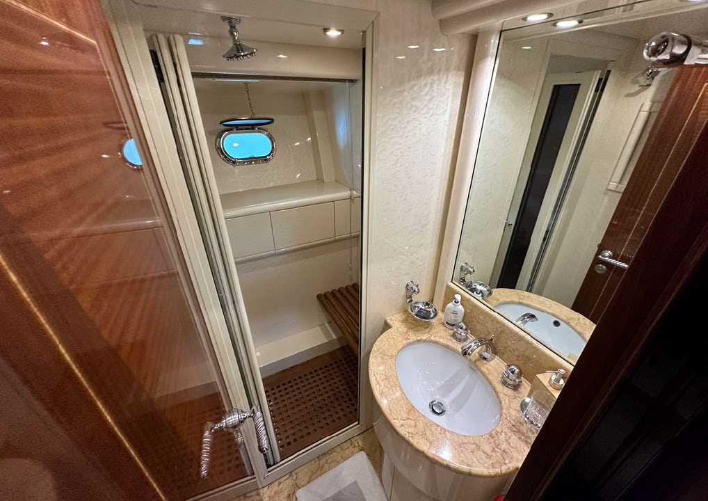 The master cabin is located forward, featuring a comfortable double bed, wardrobe space, seating and notably, a separate head to port and a shower room to starboard, each with a vanity unit, effectually providing his and hers bathrooms. The two additional guest cabins are located aft, with a twin cabin featuring a Pullman to port, and a double cabin to starboard, both of which are ensuite.