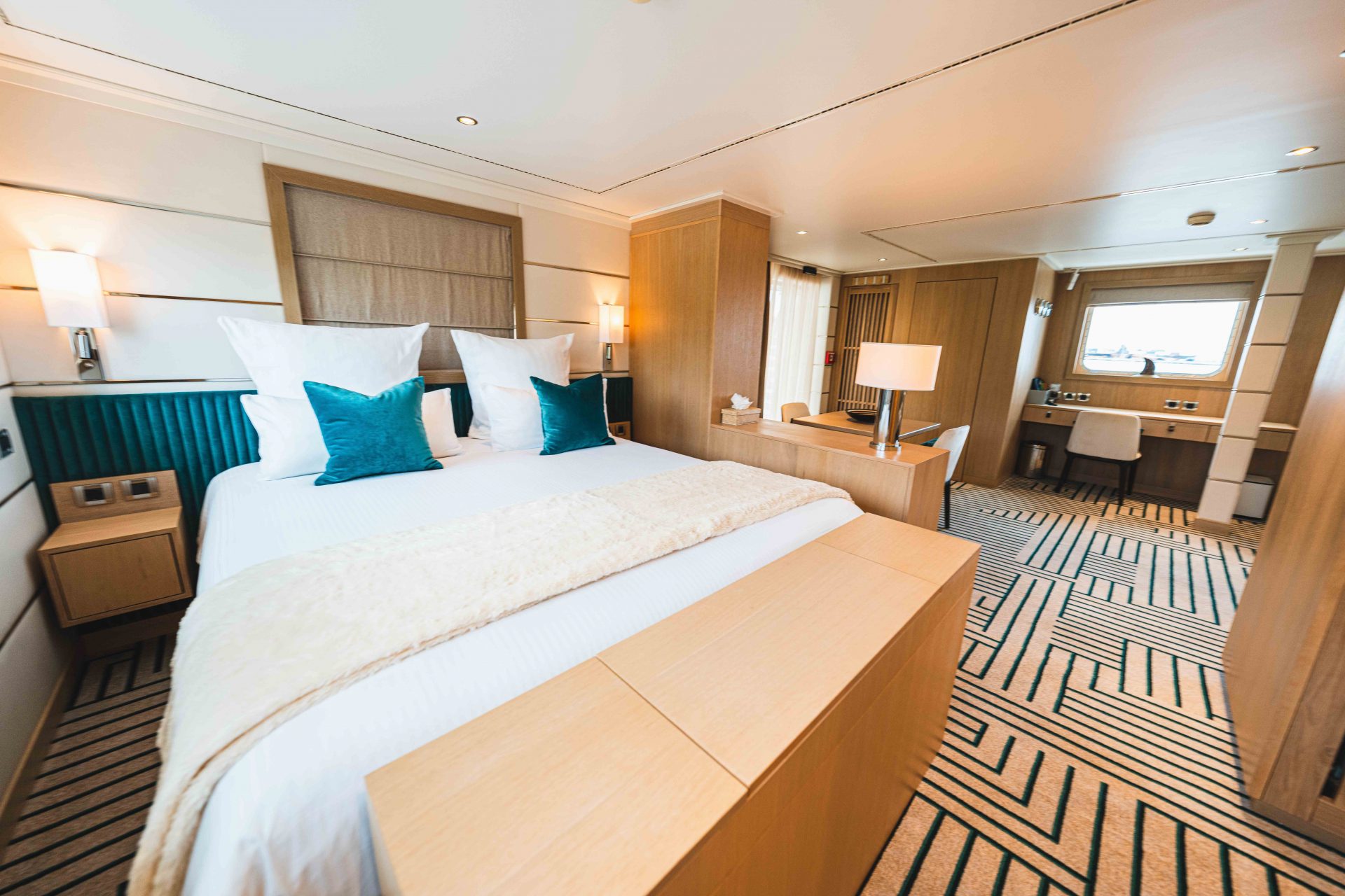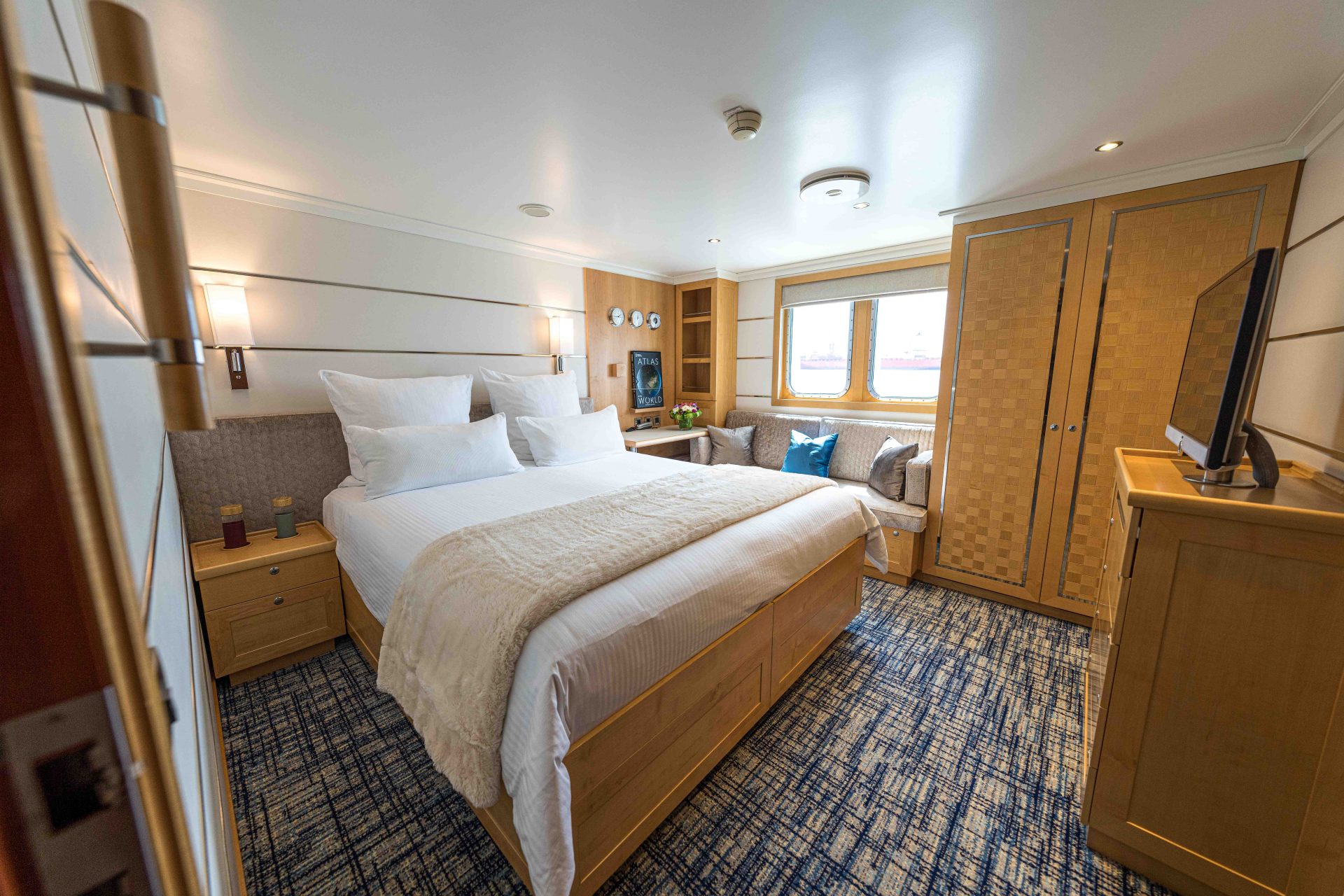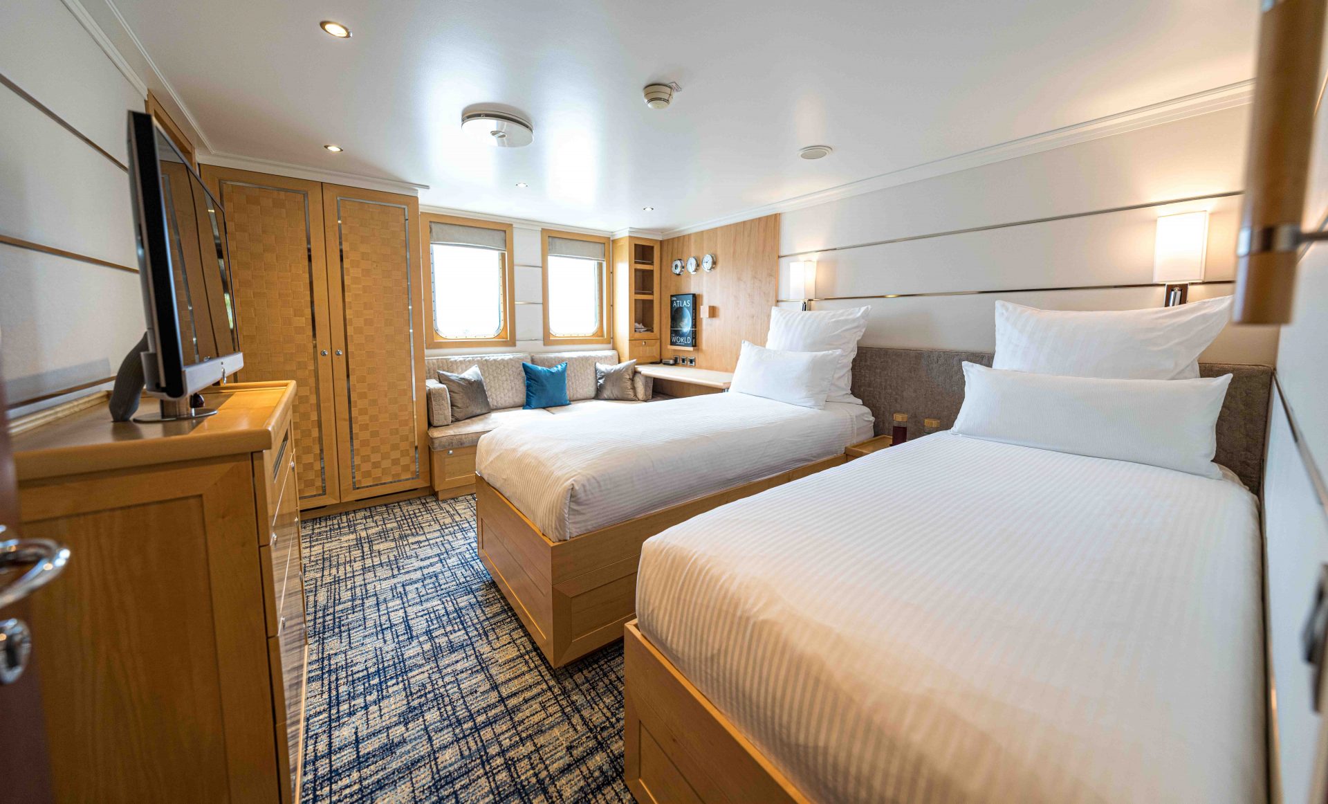 Hanse Explorer can accommodate up to 12 guests across 7 en suite cabins. The expansive master cabin, 485 sq ft, is situated on the Upper Deck and features a large private lounge area. The remaining 6 ensuite cabins, all roughly 182 sq ft, are situated on the Main Deck and can be configured for either double or twin sleeping arrangements.