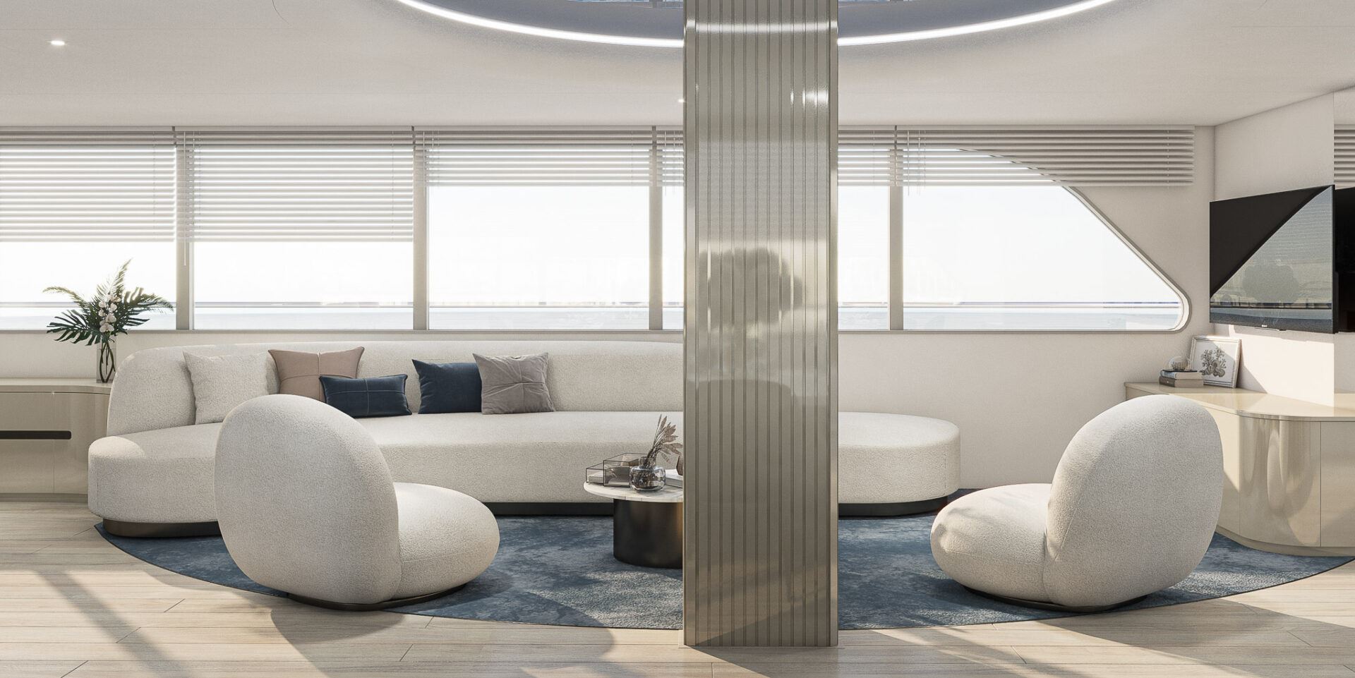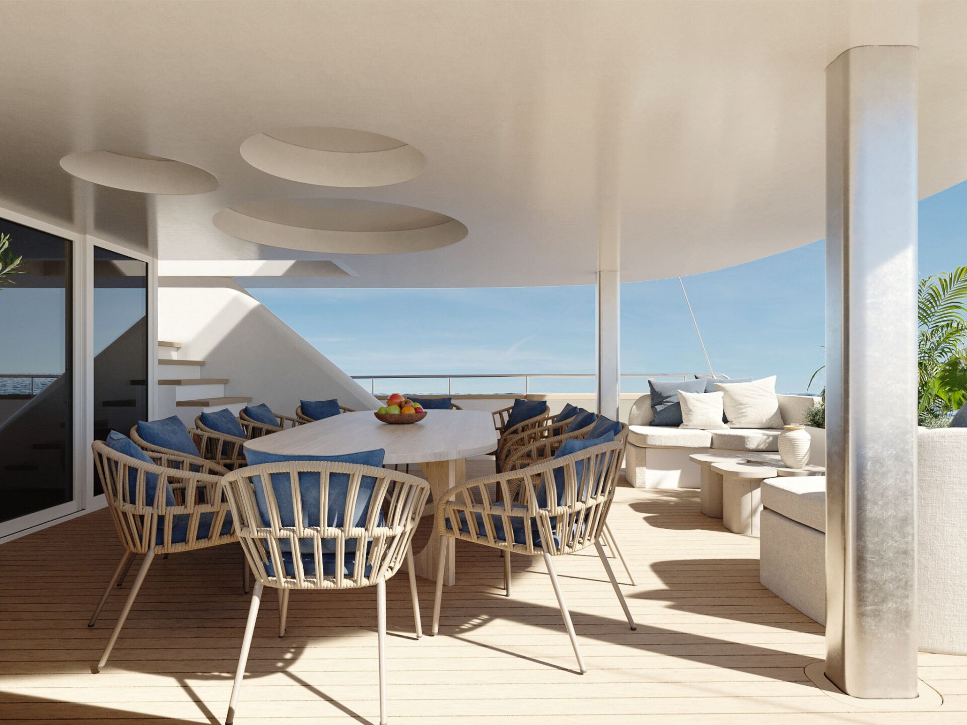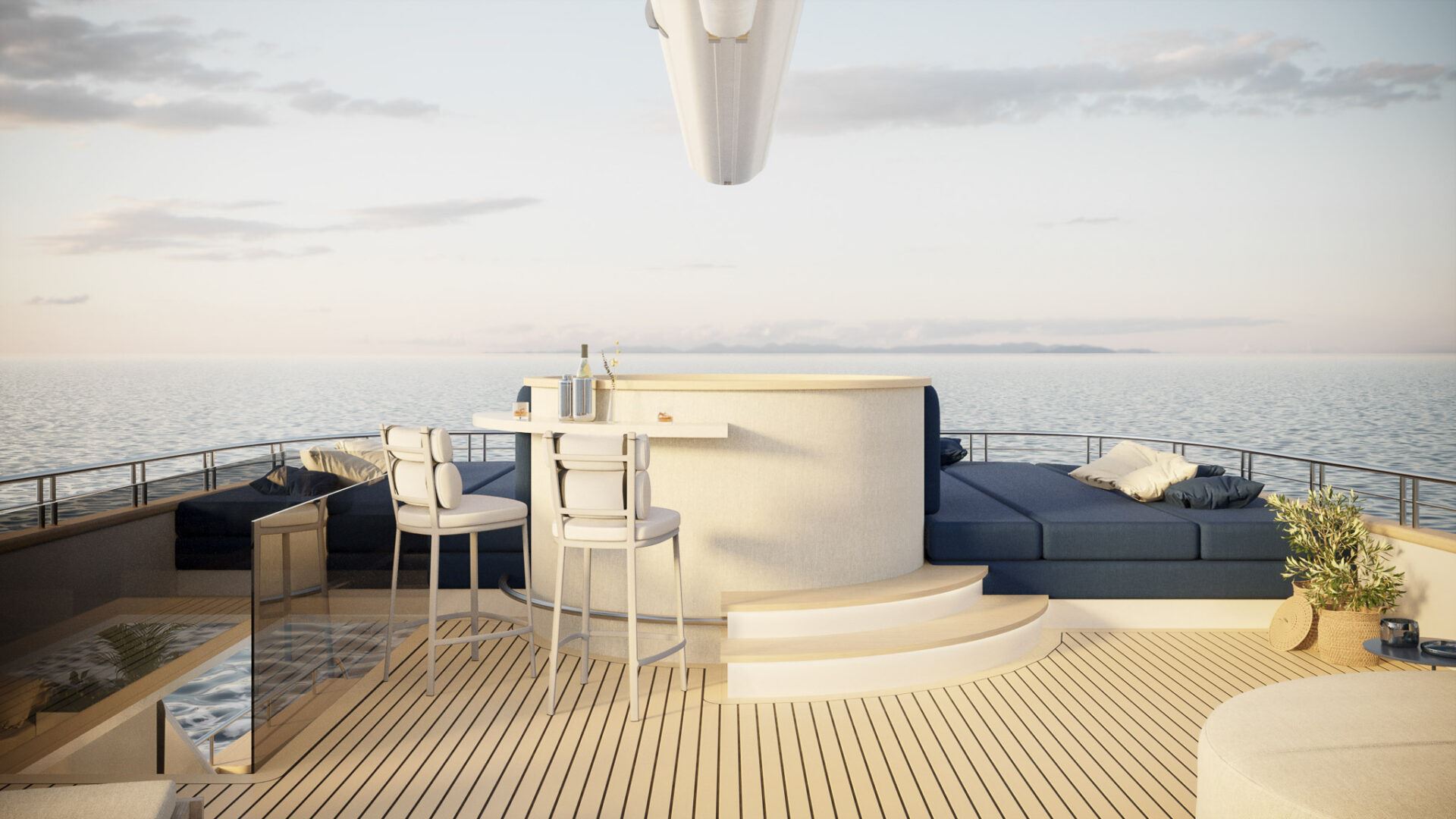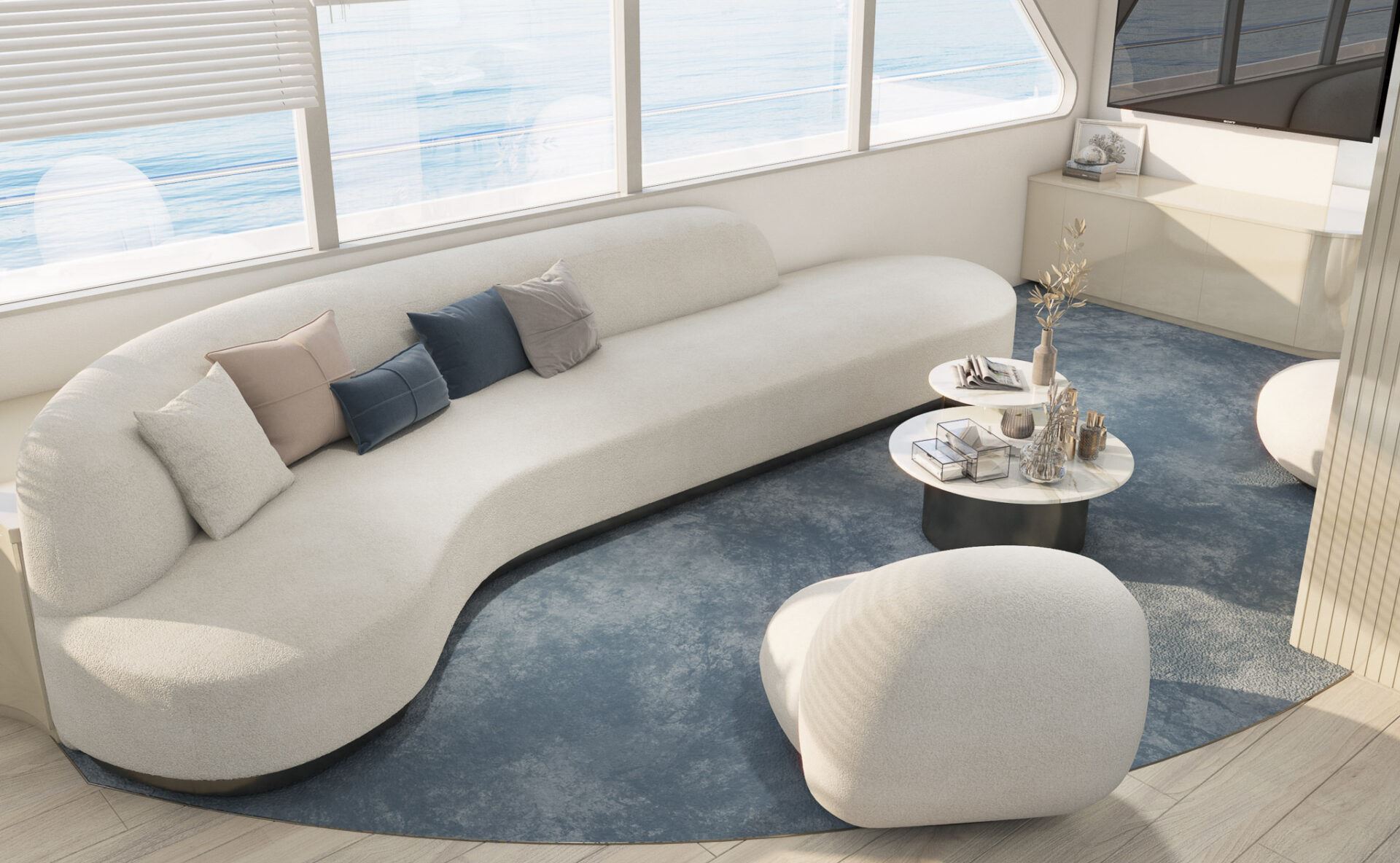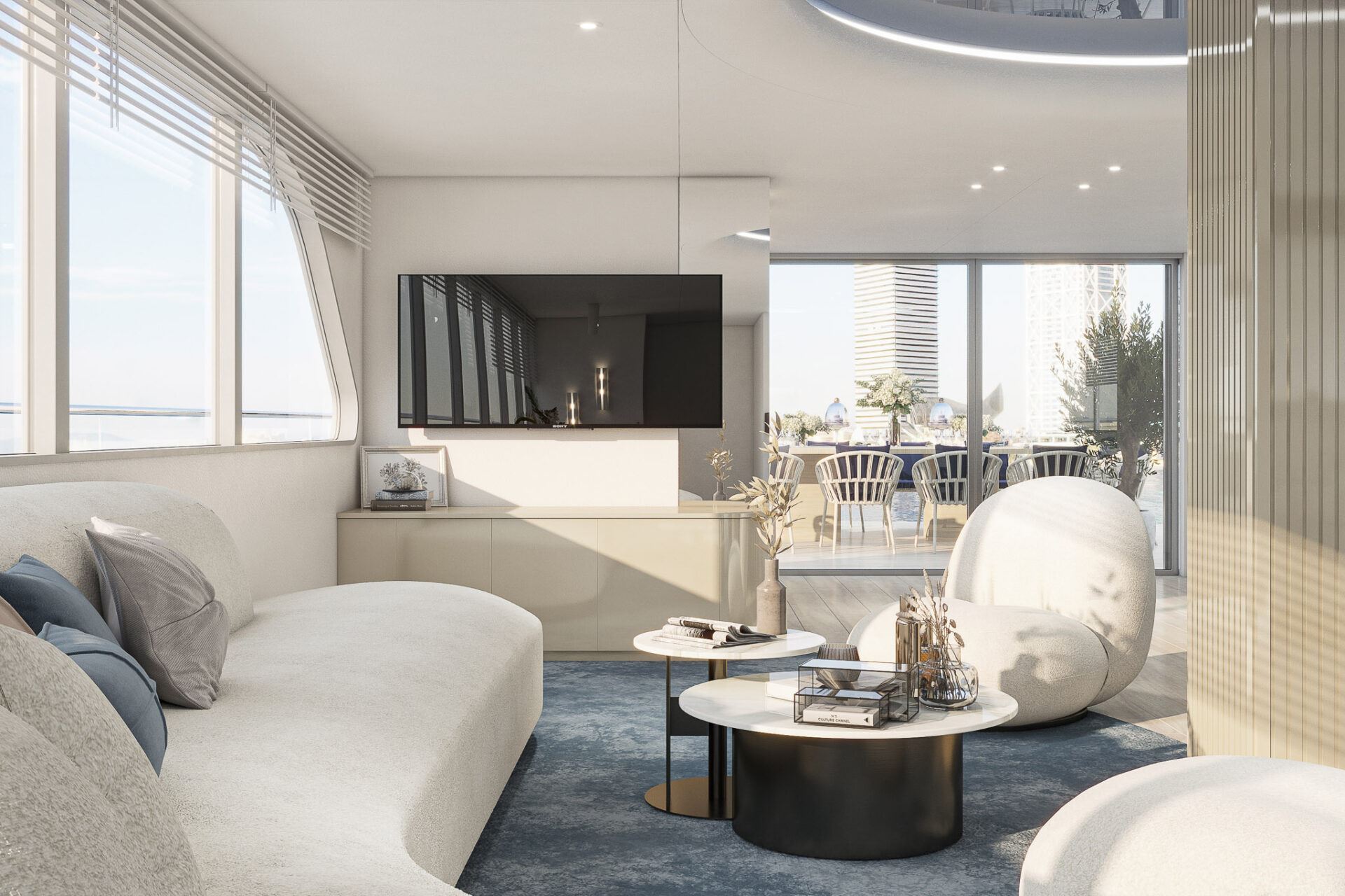 Inside, he elegant and modern salon of Yacht Maxita creates a relaxed environment perfect for recharging and socialising. Guests can dine at the large dining table, lounge on the white oval sofa, or enjoy a beverage at the fully stocked bar. The smartly designed spacious sundeck includes an open-air cinema, BBQ, another bar, jacuzzi, and several lounging areas. An additional dining table on the sundeck allows guests to savor delicious meals while enjoying breathtaking nearby scenery.
