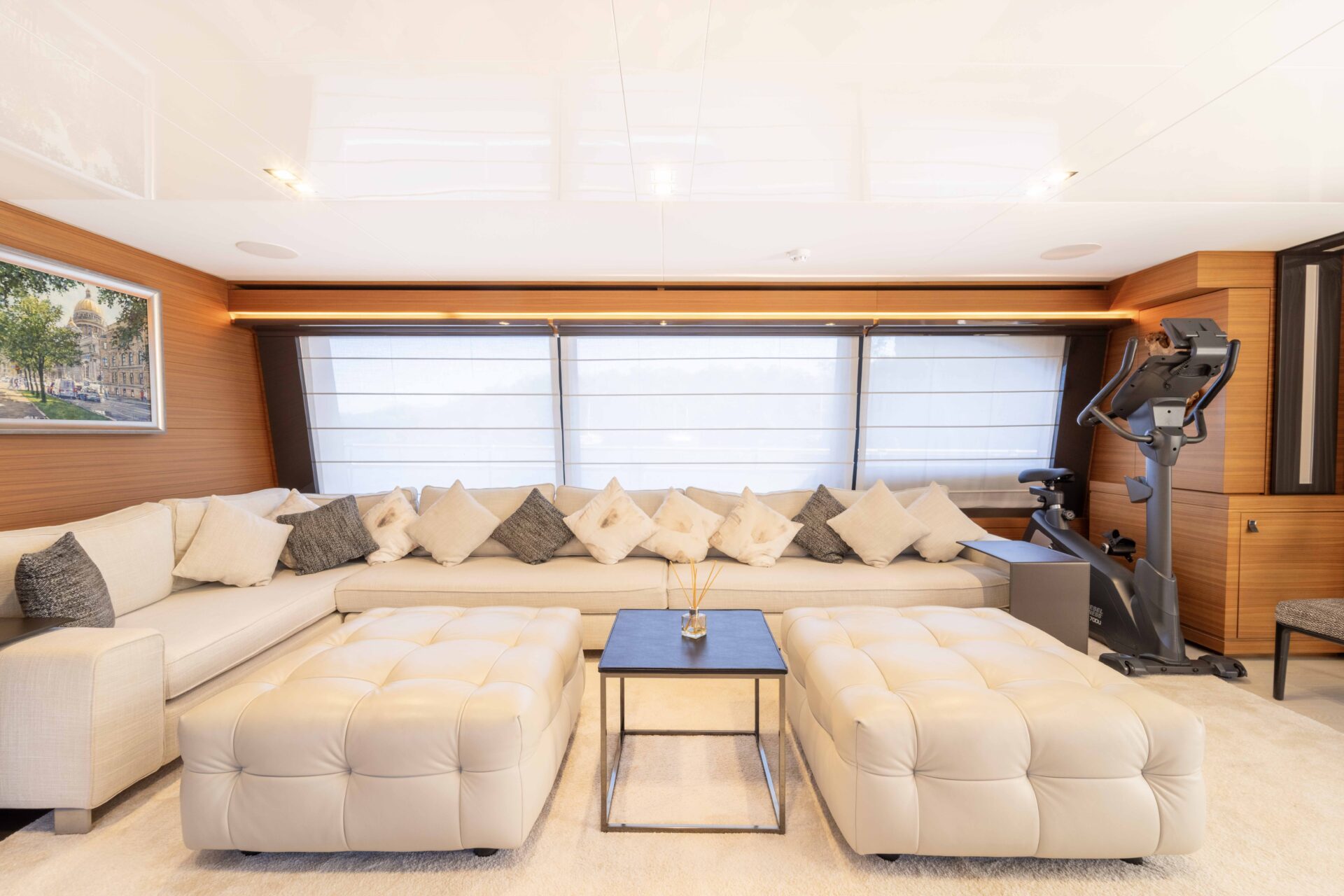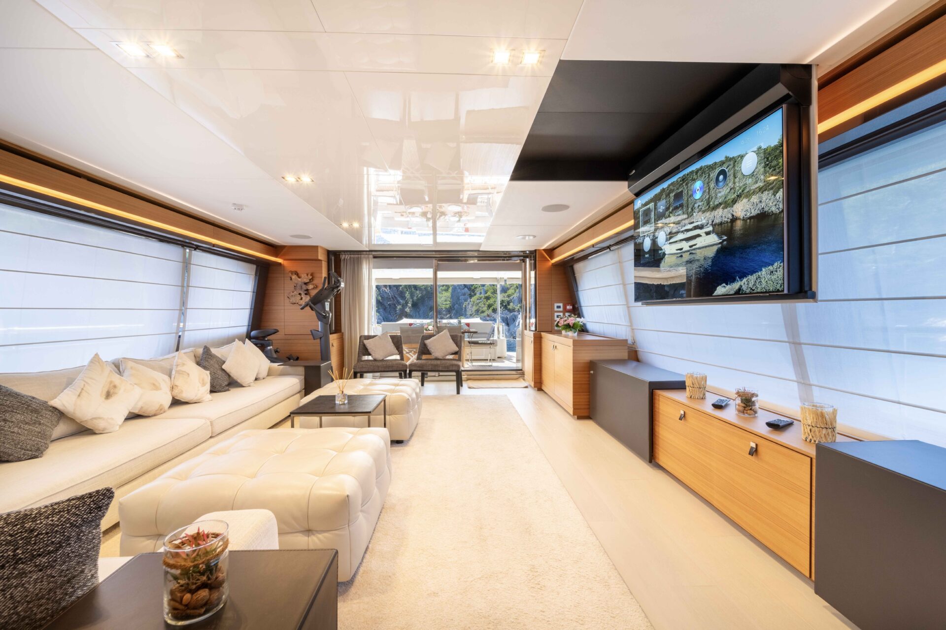 Heading inside, guests will be greeted by Milena’s expansive main salon. Bright and airy with neutral tones, it offers a serene environment, equipped with lots of comfortable seating and a fold down television for entertainment.