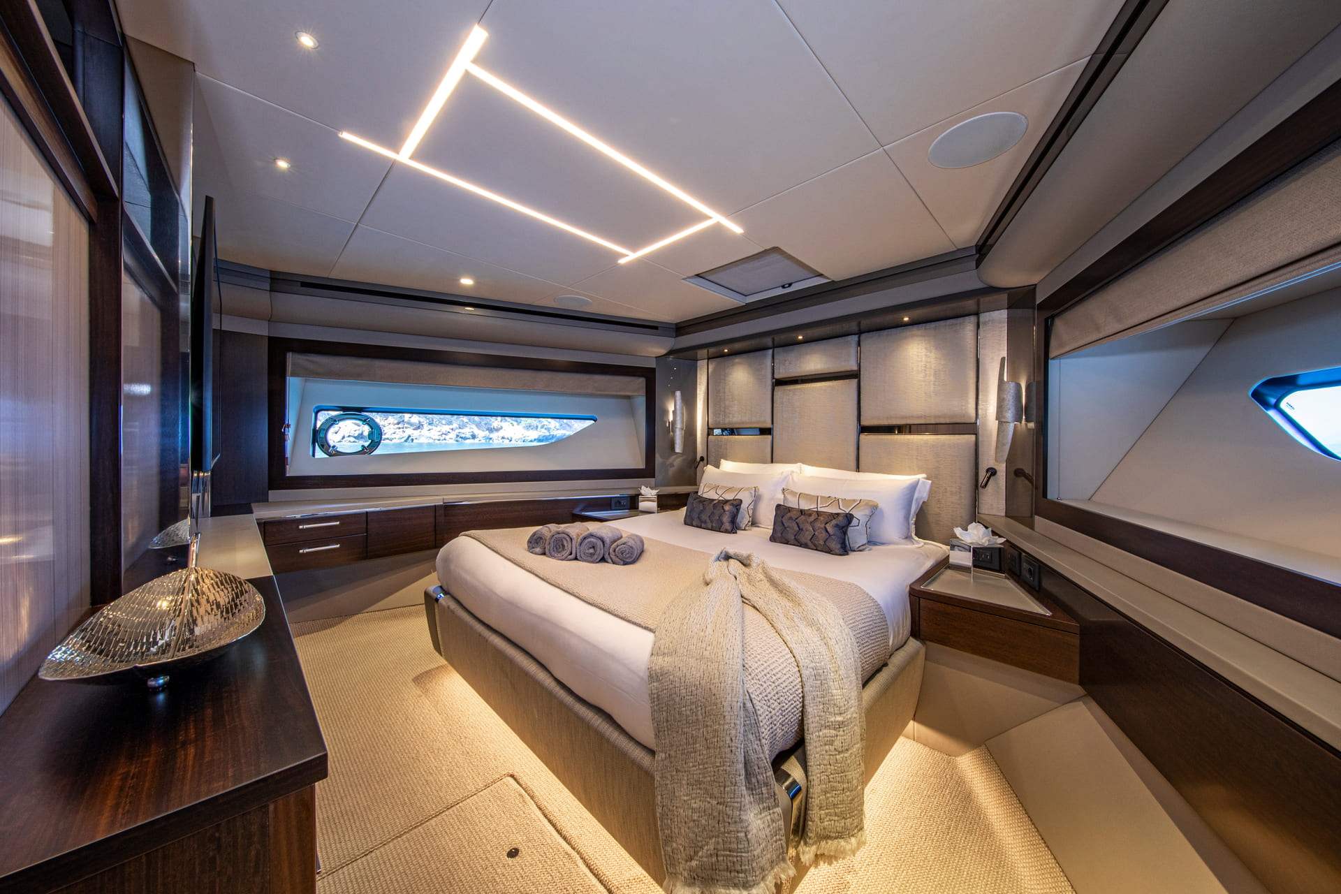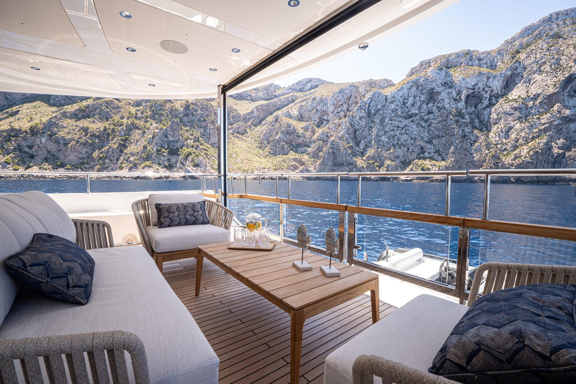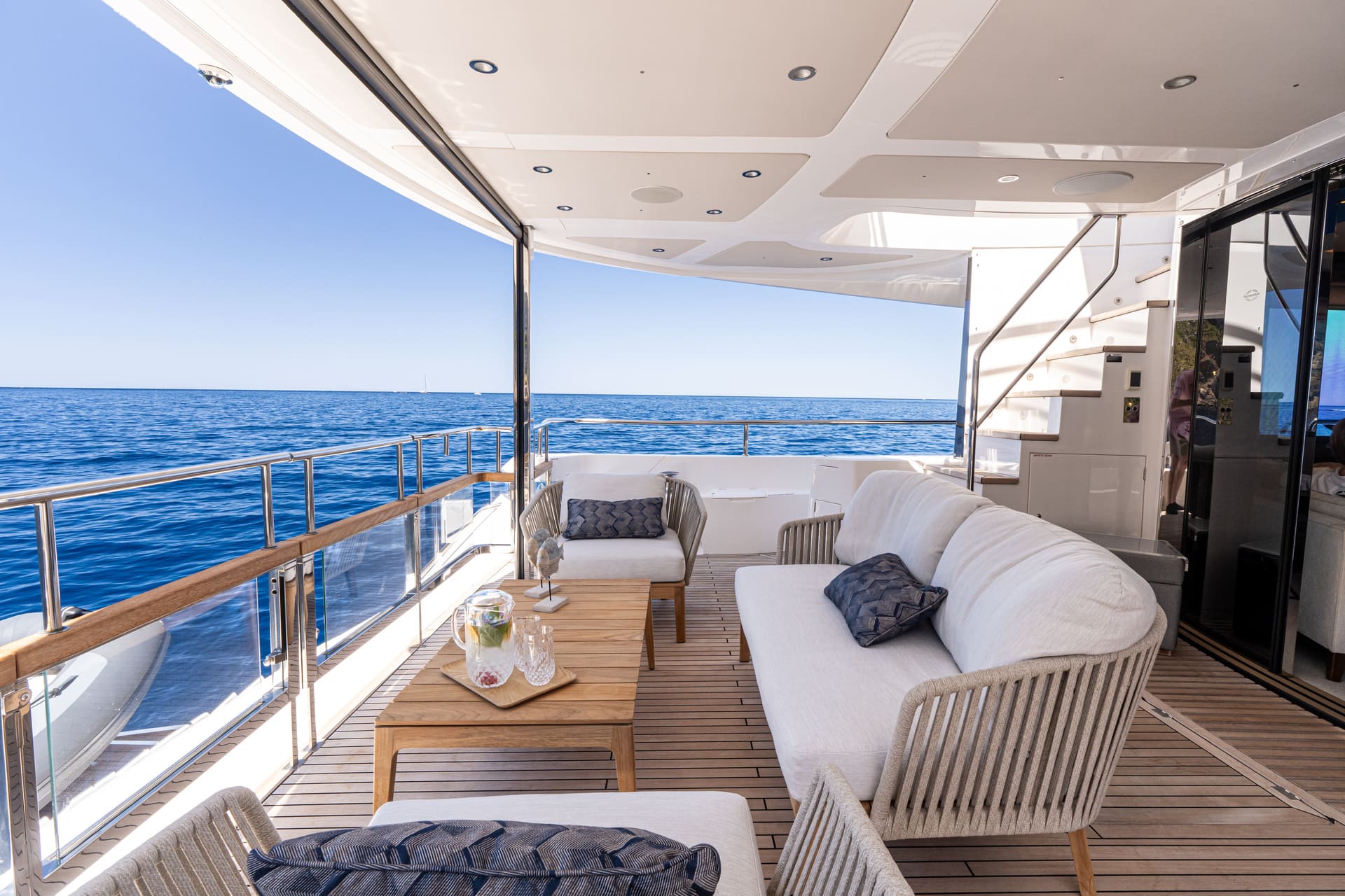The spacious flybridge is another haven for entertaining, boasting abundant seating covered by a retractable awning, alongside a large dining table and a large sunpad, with room for additional sun loungers.