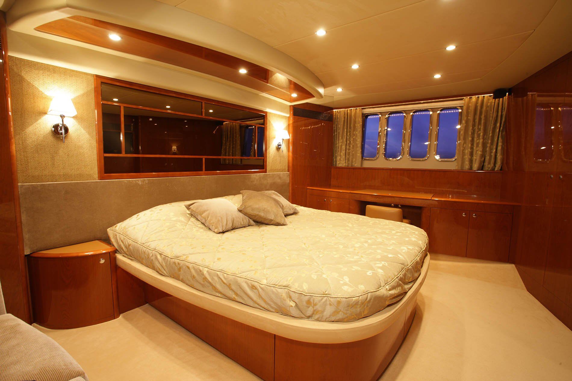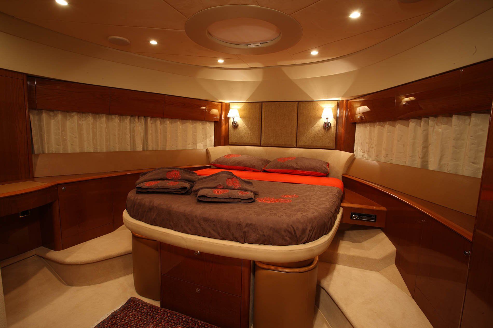 With this three-cabin versus, the guests benefit from spacious accommodation and generous bathrooms that maximise the use of the interior volume: a full width owner’s stateroom, a further VIP stateroom forward and a two-berth cabin to port.