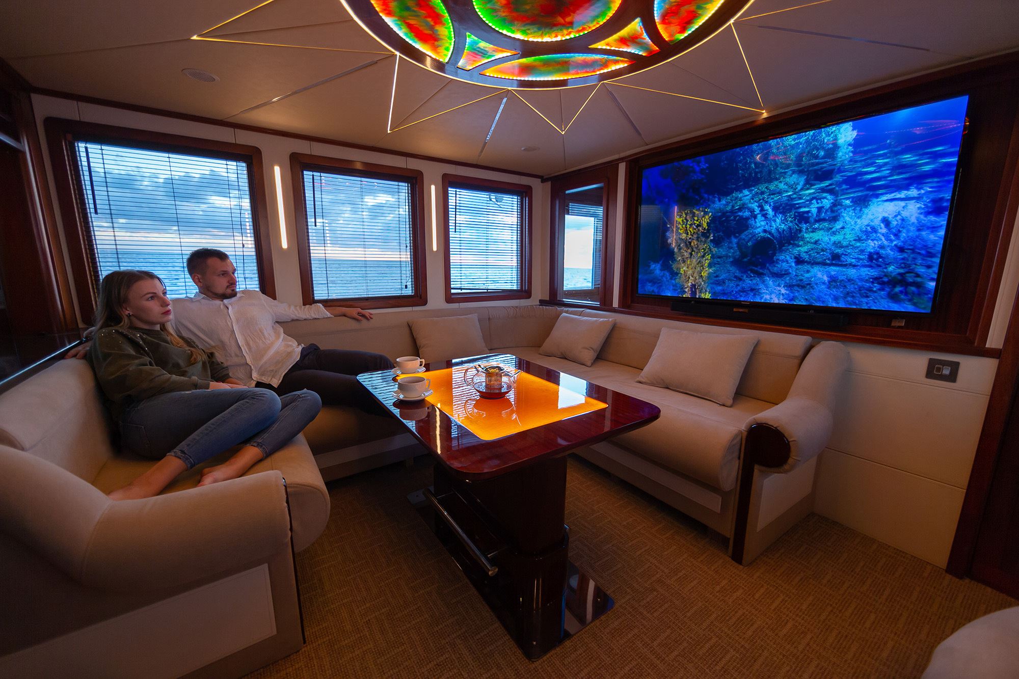 The newly renovated interior of U Boat Navigator features accommodation for up to 6 guests in one master cabin and two twin cabins. The interior also houses a spacious main saloon that is perfect for relaxing after a long day exploring the ocean floor. On the exterior, the vessel has the benefit of a large superyacht-style covered flybridge complete with lounging area, bar, and alfresco dining options.