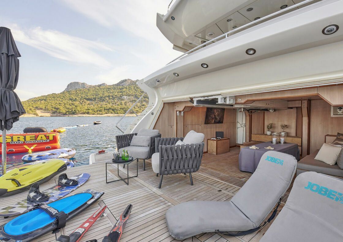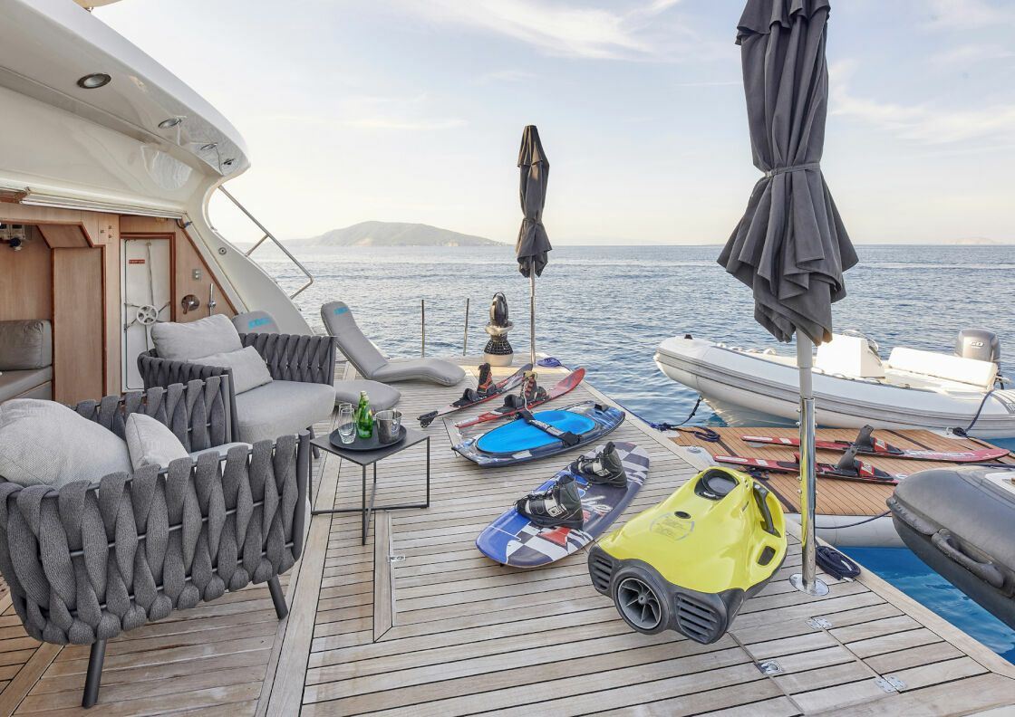 When not cruising, she reveals a treasure trove of water toys and accessories to immerse you in the surrounding waters. Take to the sea on a thrilling Jet Ski, indulge in towable toys for fun and adventure, or embark on water skiing excursions that cater to all skill levels. Scuba diving equipment, Seabobs, wakeboards, canoes, and fishing gear offer endless opportunities for aquatic delight. Additionally, as a certified PADI Dive Centre yacht, she offers an opportunity for you to obtain your esteemed PADI diving card, elevating your journey to new depths of exploration.