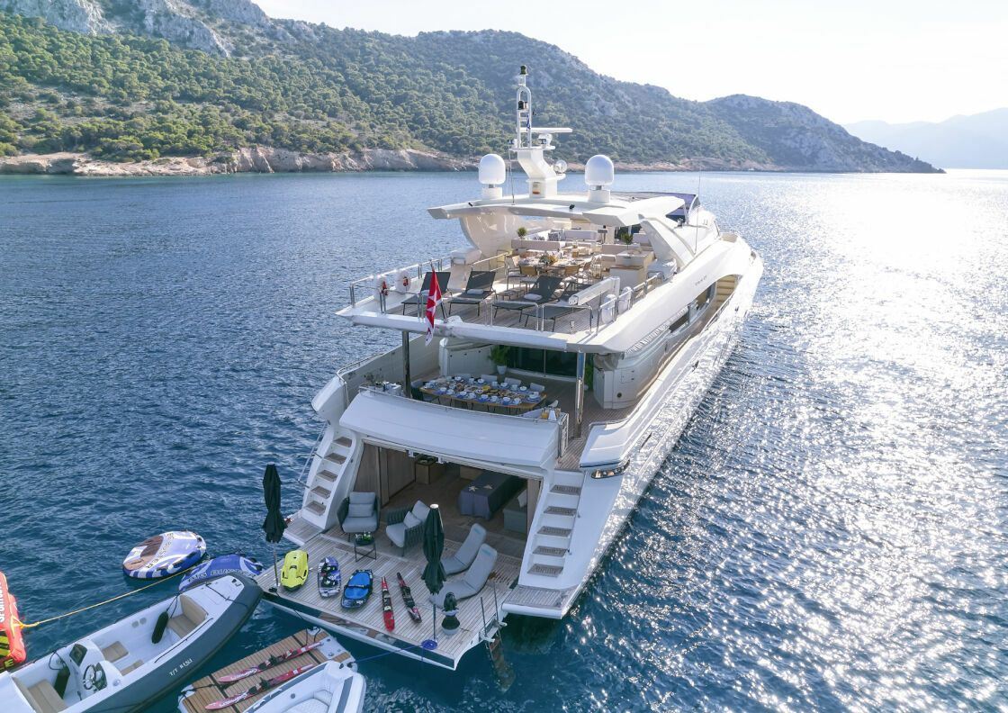 Step into the world of opulence and adventure aboard Rini, a Posillipo Technema 120 motor yacht designed to elevate your luxury yacht charter experience with family and friends. This extraordinary vessel offers a wealth of convivial spaces, ideal for indulgent relaxation or engaging in thrilling water activities with an array of water toys at your disposal.