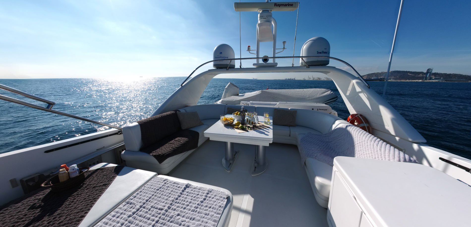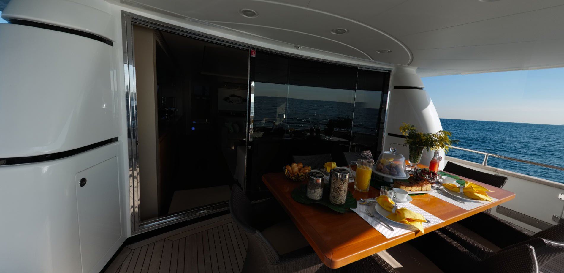 The flybridge is arranged around a social dining table, surrounded by seats and sunpads. There is a large bimini for full or partial shade from the sun. There are also sunpads on the bow, offering up a more secluded, intimate space, and an al fresco dining option on the aft deck.