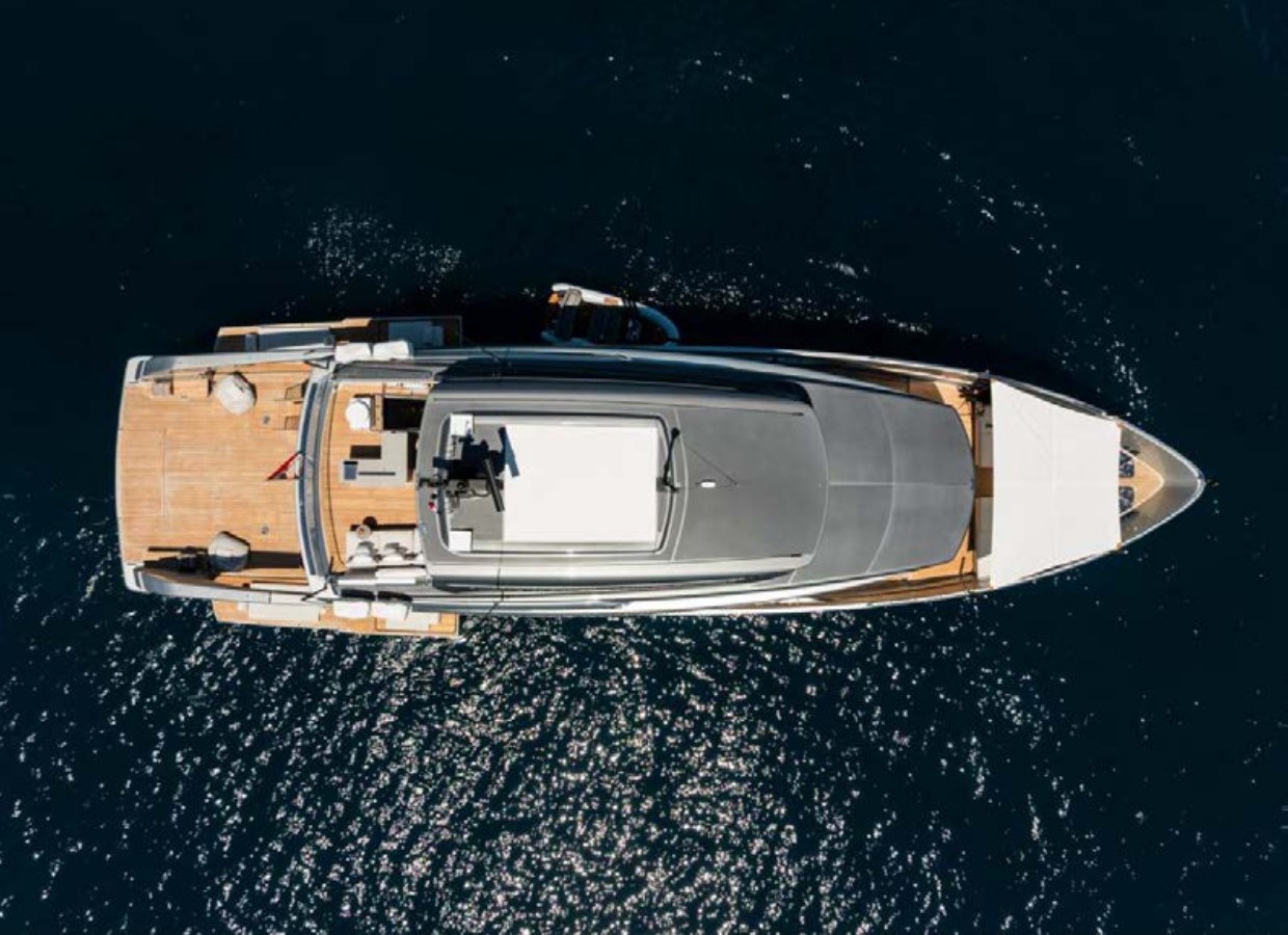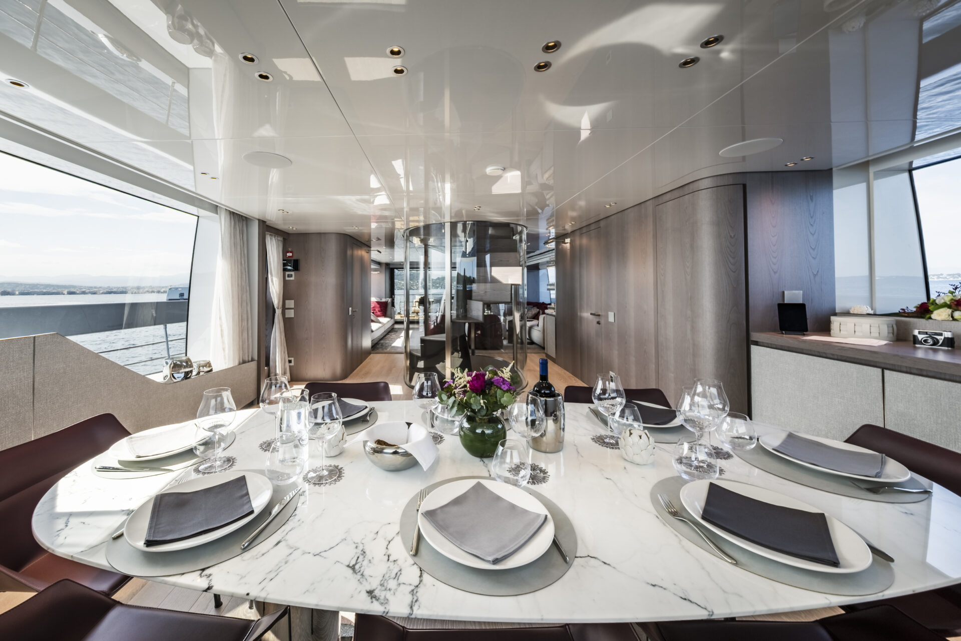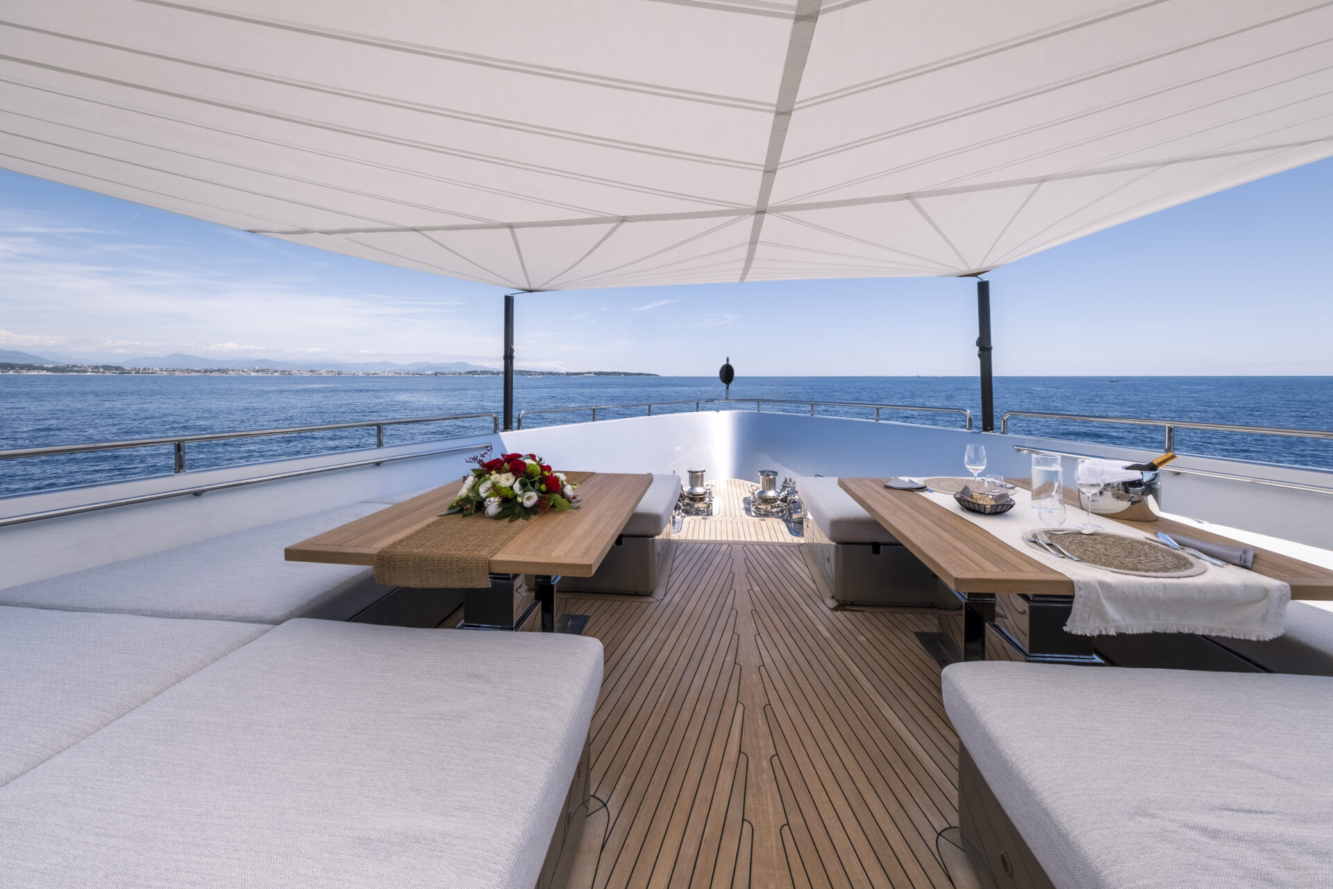 The yacht features spacious, light-filled interiors and expansive outdoor areas designed for relaxation and entertaining. The swim platform features innovative fold-out sections that transform into sun-soaked lounges, while other areas provide versatile spaces for dining, socializing or simply enjoying breath-taking panoramic views.
