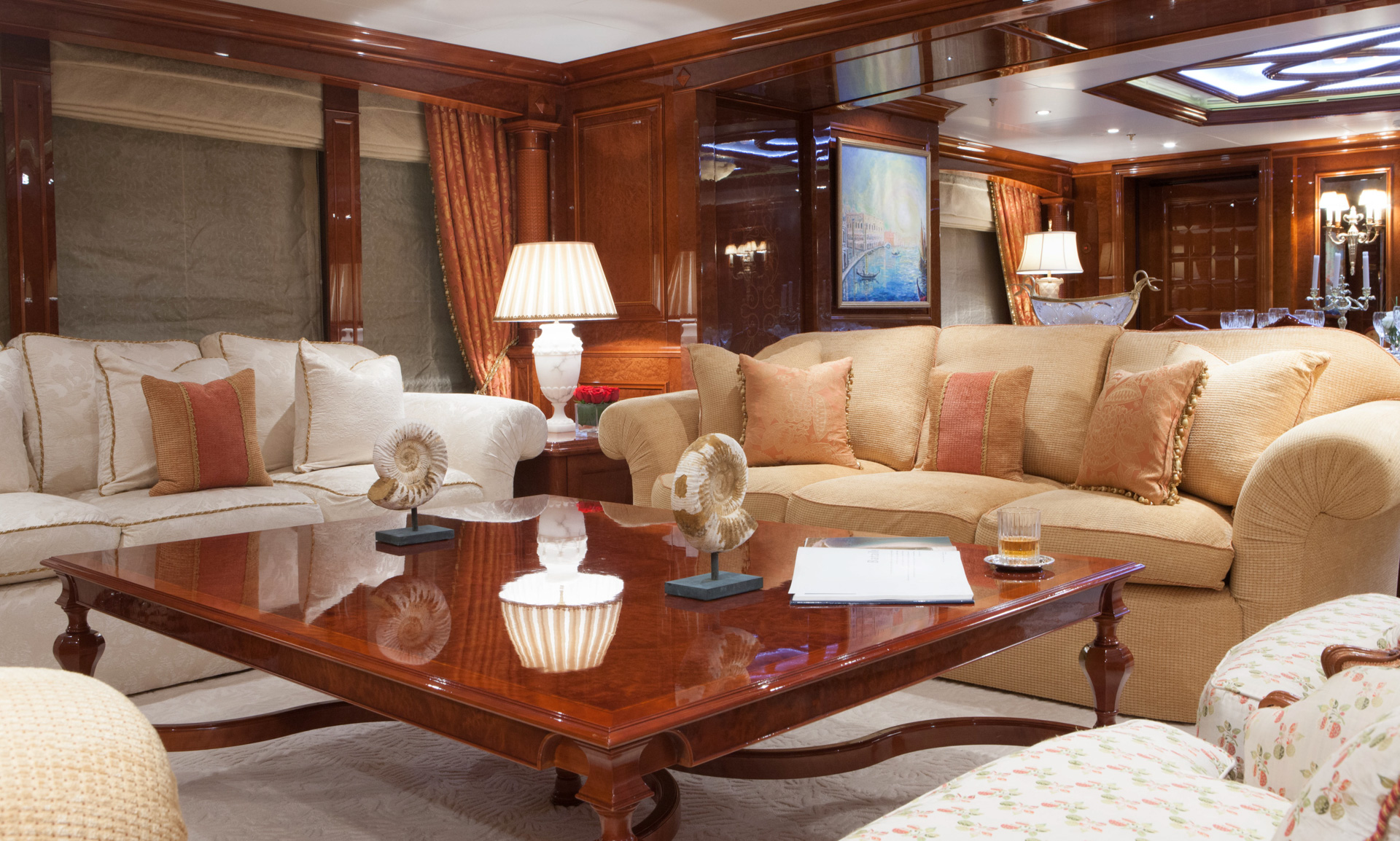 Throughout her interior living spaces are finished to the highest standards, evident in her beautiful mosaic floors, sculptured tables that rise and fall, and detailed marquetry. The Italian Riviera-style creates a lavish atmosphere on board, featuring a floating staircase which spans three decks is topped by a skylight and peeks into the bottom of the sun-deck pool.