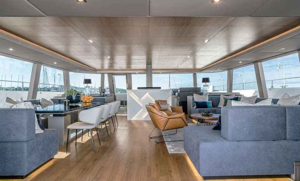 The main saloon, adorned with awe-inspiring panoramic glazing, embodies an ambiance of serene refinement, achieved through the harmonious interplay of teak wood, sintered quartz, and metallic accents. Encompassing an impressive expanse of 47 square meters, the saloon reveals a graceful lounge area to starboard, alongside an inviting dining space to portside. The starboard sofa, with its fully-folding backrests, beckons for leisurely reads and afternoon reveries, while a shallower sofa on the opposite side provides ample seating by the dining table. Towards the bow, a bespoke island cabinet conceals a retractable TV and a spacious wine cooler.
