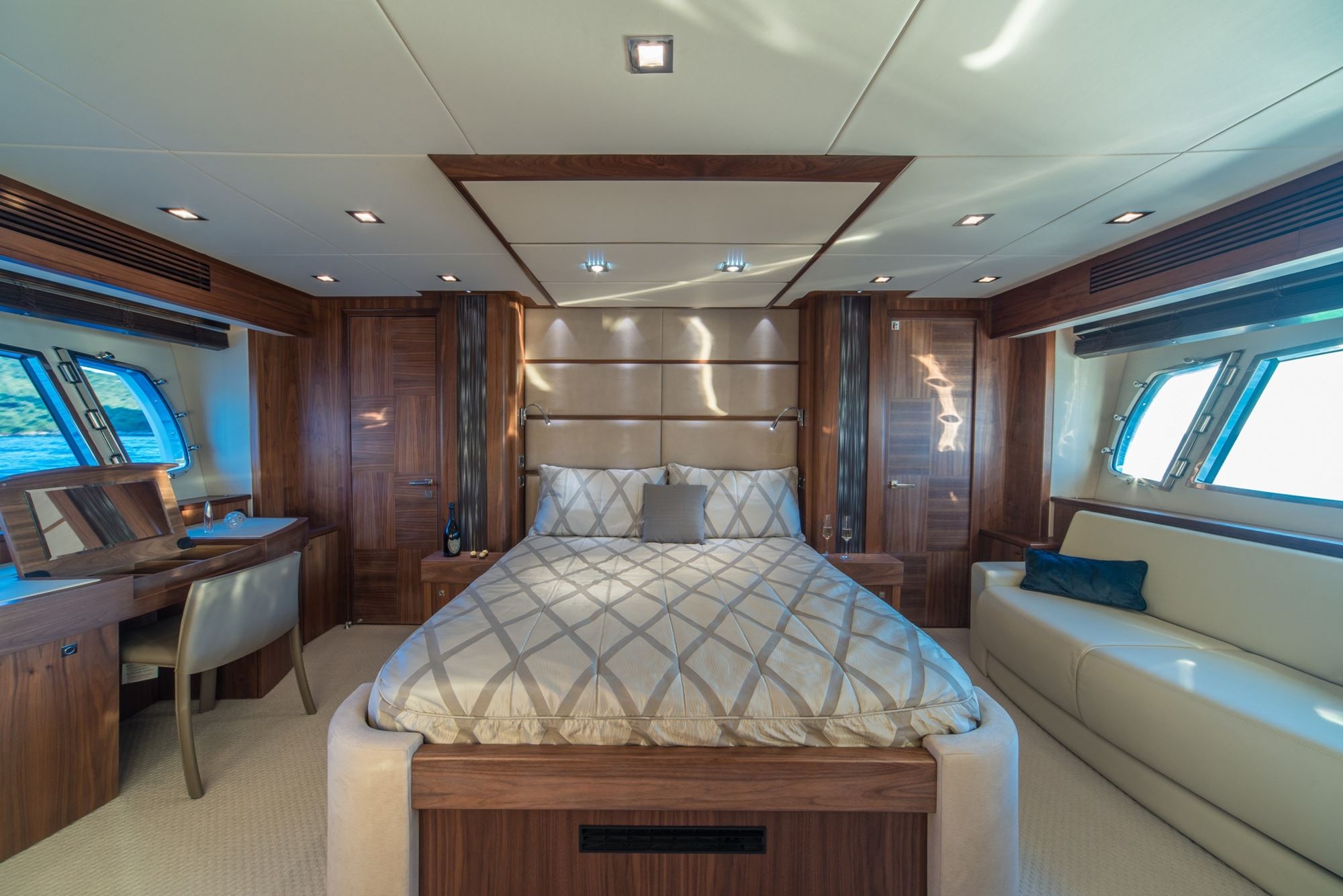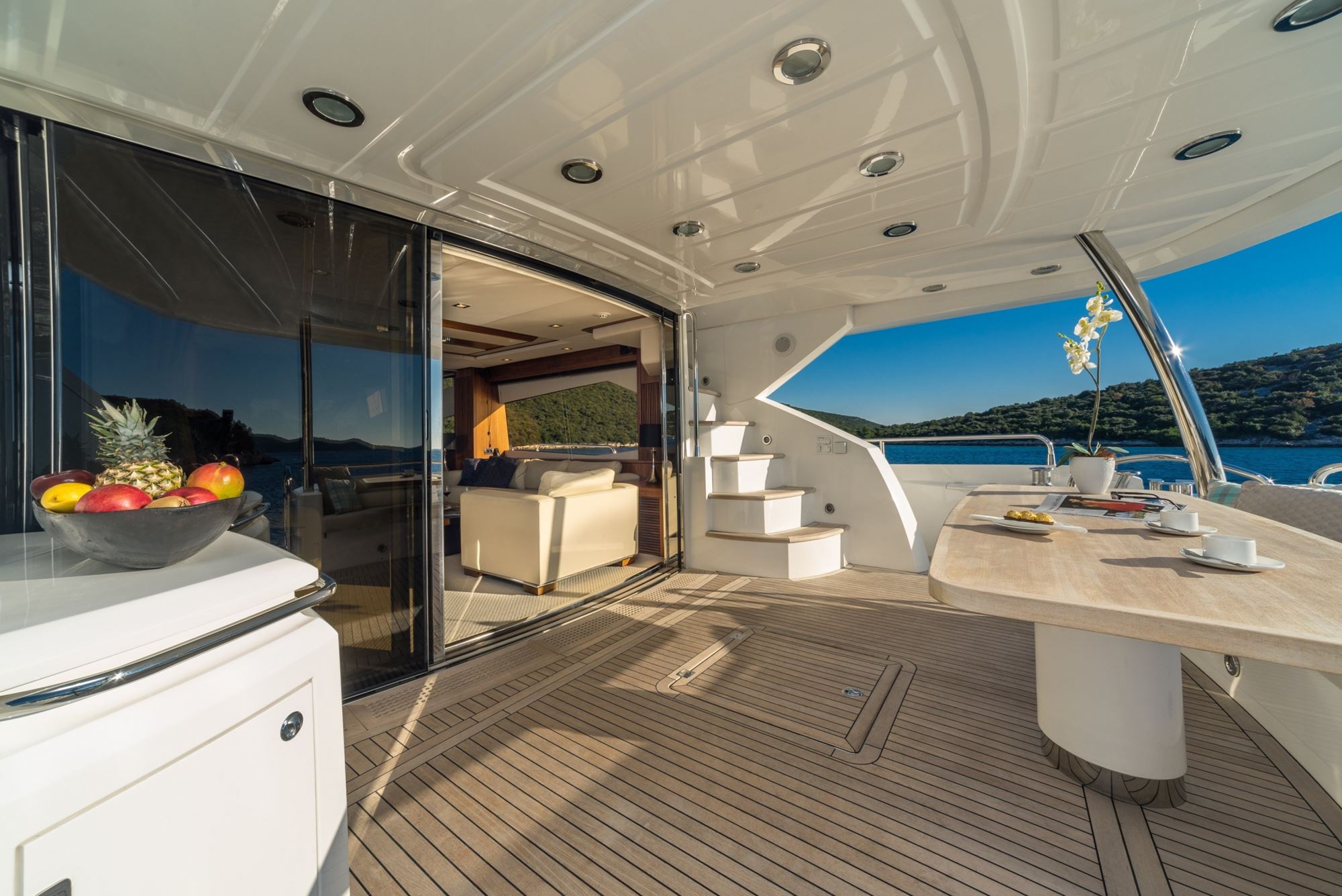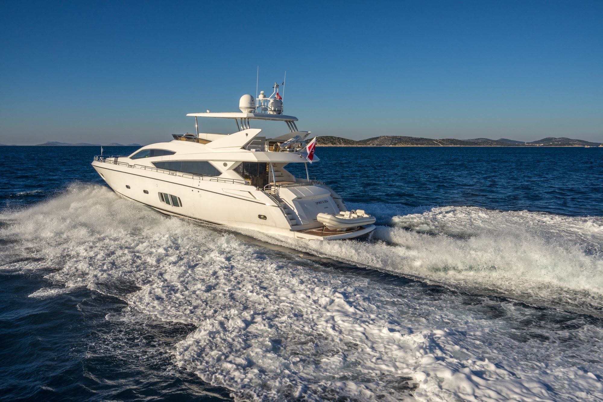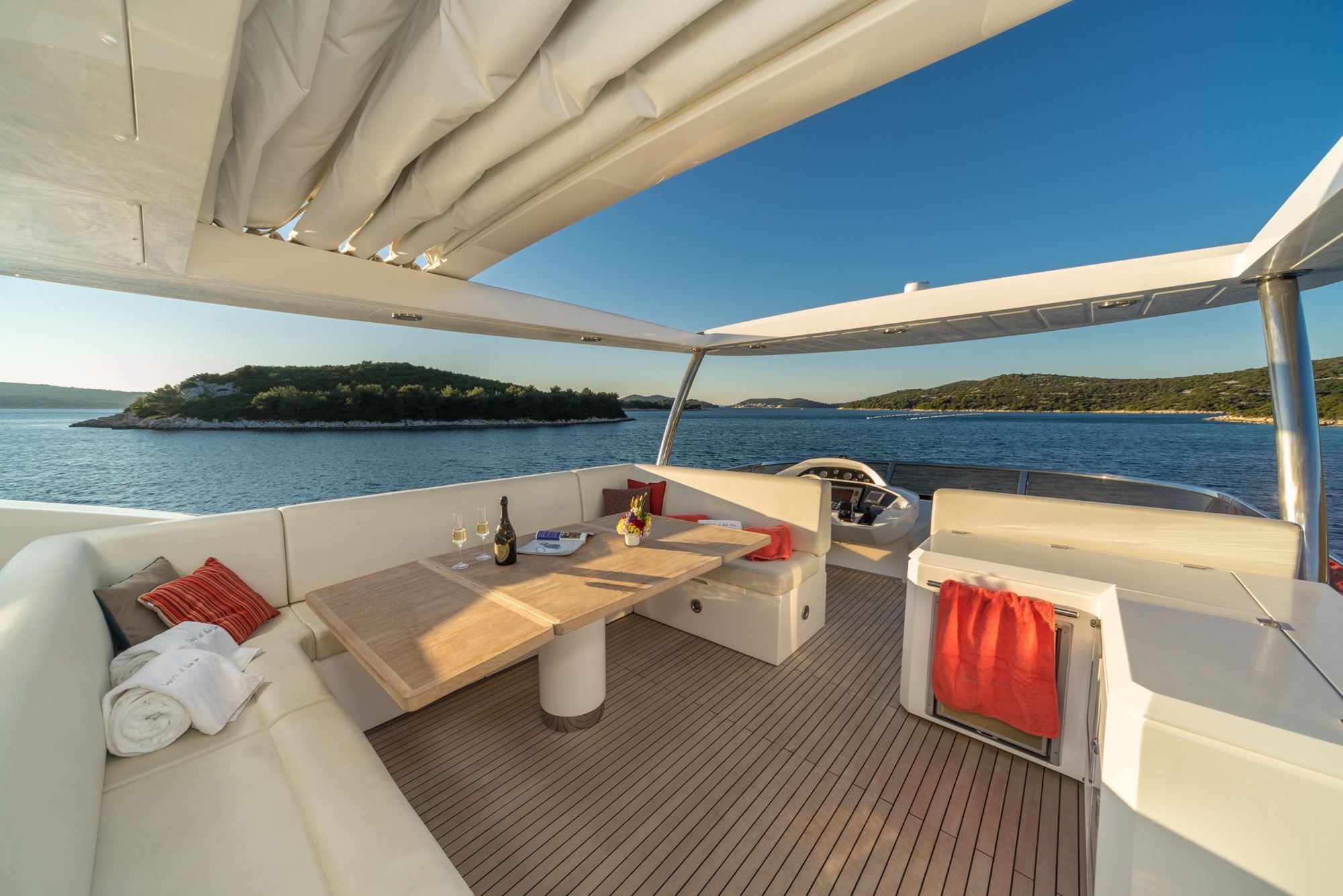 Sleeping up to eight guests in four ensuite cabins, Spirit of the Sea also boasts a spacious and luxurious saloon with separate dining area. In addition, guests can take advantage of a generous flybridge with retractable sun shade and three additional dining and lounging areas on the main deck aft and on the bow.