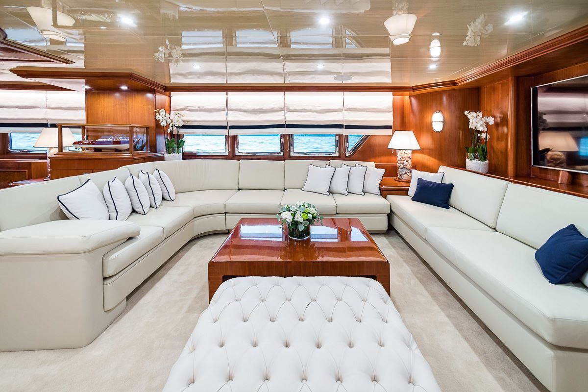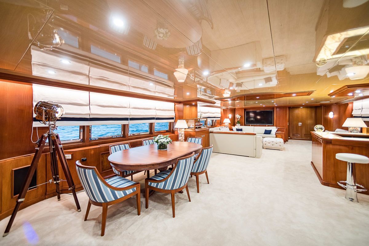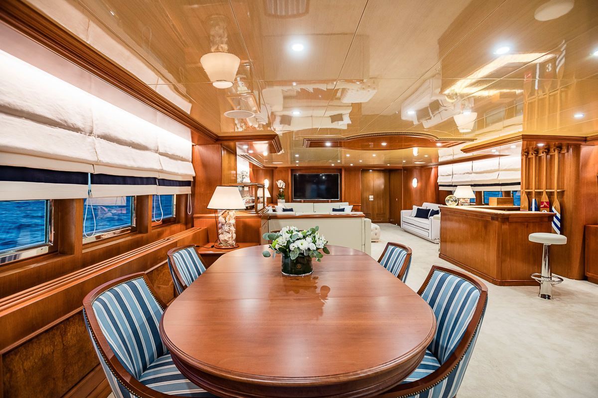 Built with a steel hull and aluminium superstructure, she offers greater on-board space and is more stable when at anchor thanks to her full-displacement hull. Powered by twin Mirrlees Blackstone engines, she comfortably cruises at 12 knots, reaches a maximum speed of 13 knots with a range of up to 5,758 nautical miles from her 94,635 litre fuel tanks at cruising speed. Wind of Fortune features at-anchor stabilizers providing exceptional comfort levels.