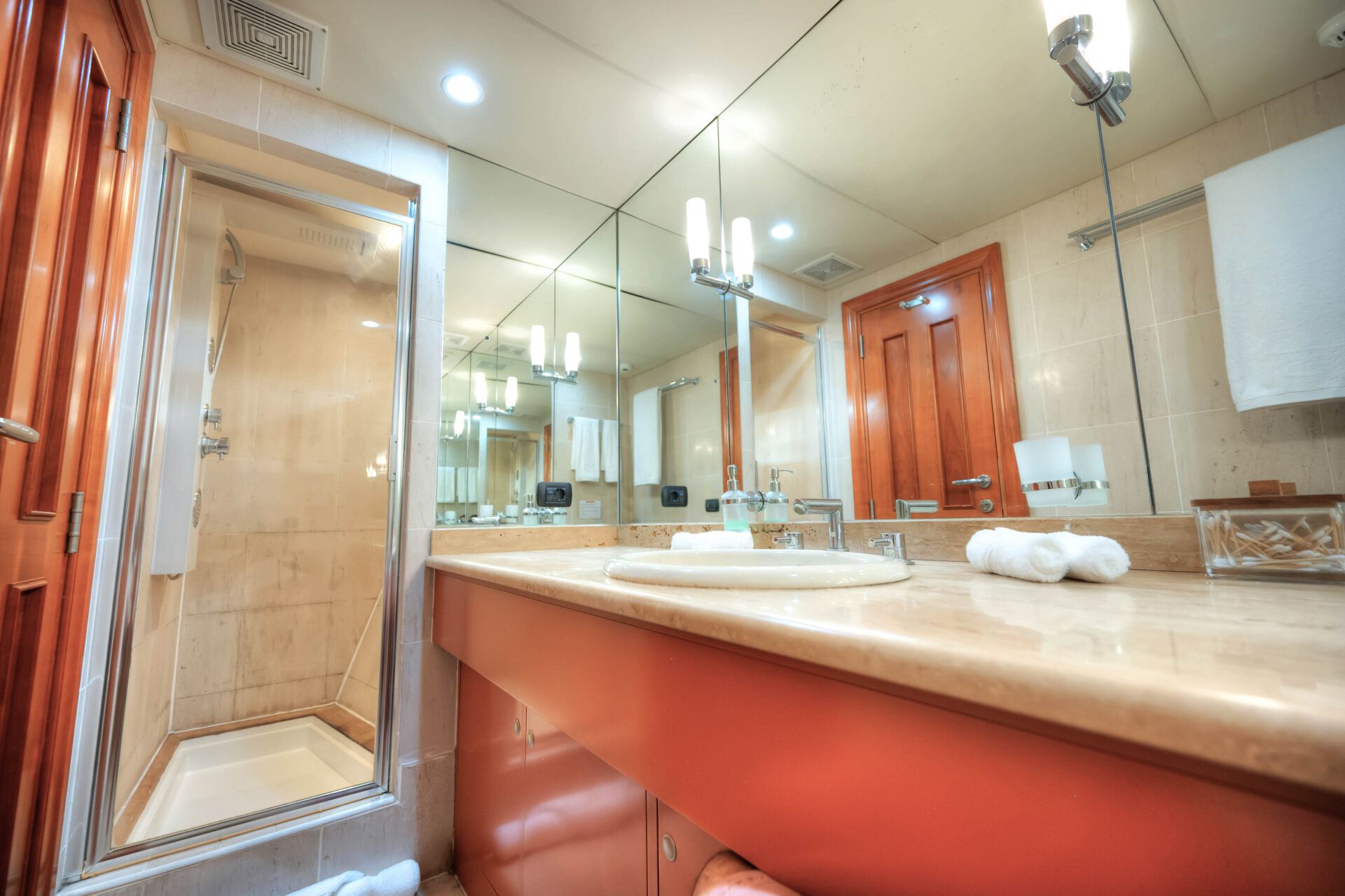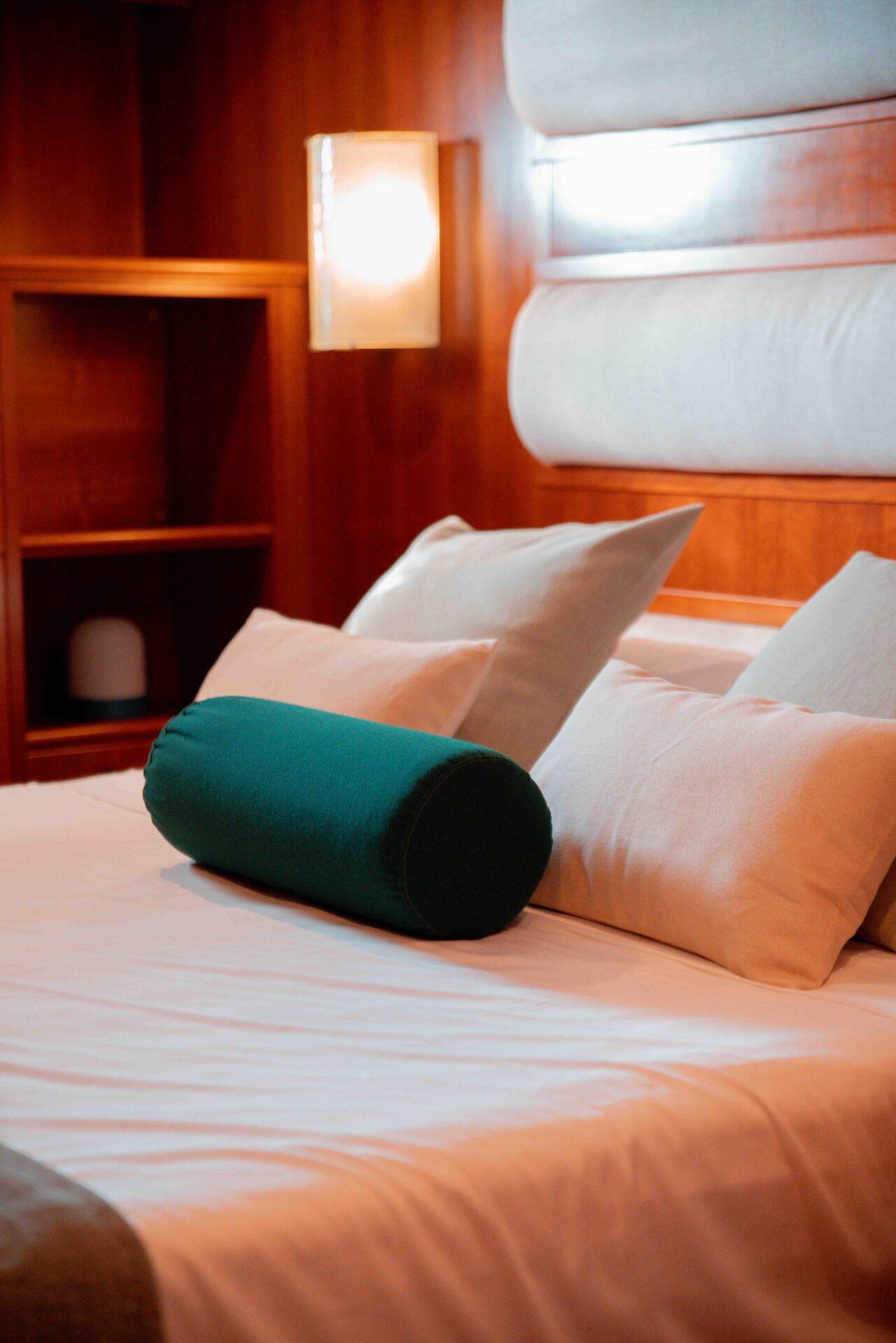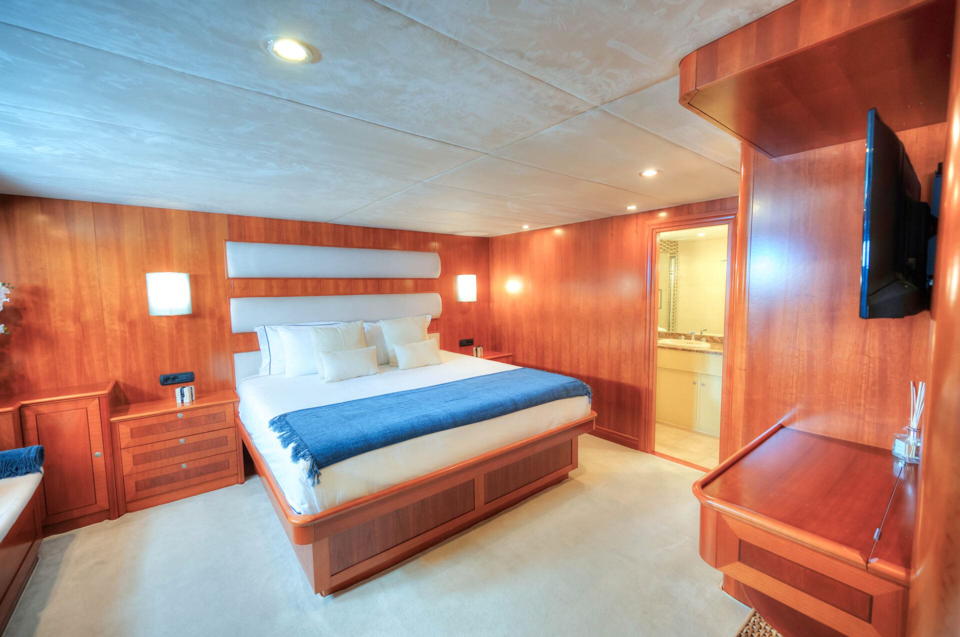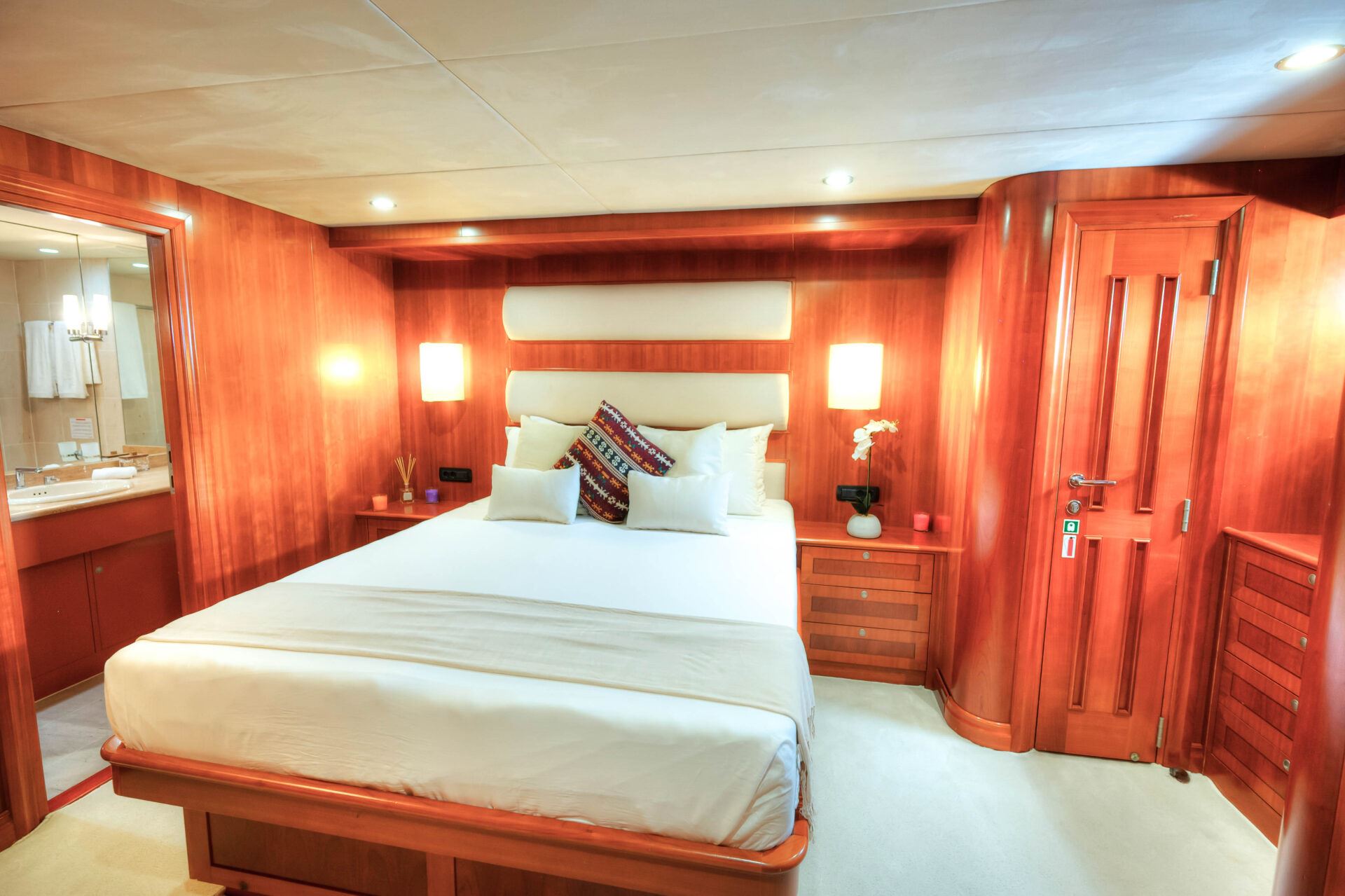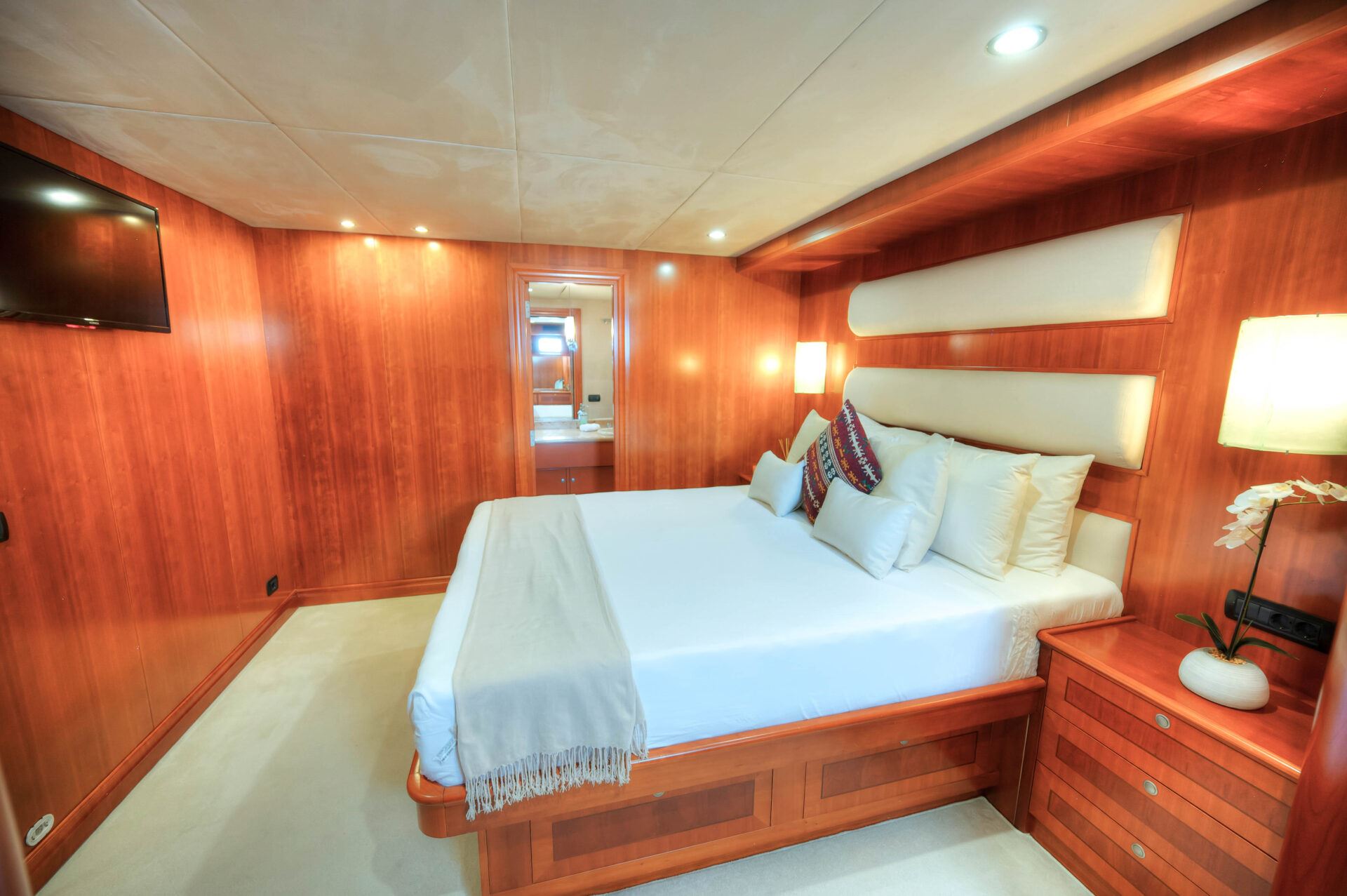 Inside, Voyager’s interior design is by Stephen Seaton. The main salon is bright and open with a beautiful dining area. Up to eight guests can be accommodated in four well-appointed ensuite cabins throughout three doubles and one twin. The master cabin is exceptionally spacious, with a large ensuite featuring his and her sinks.