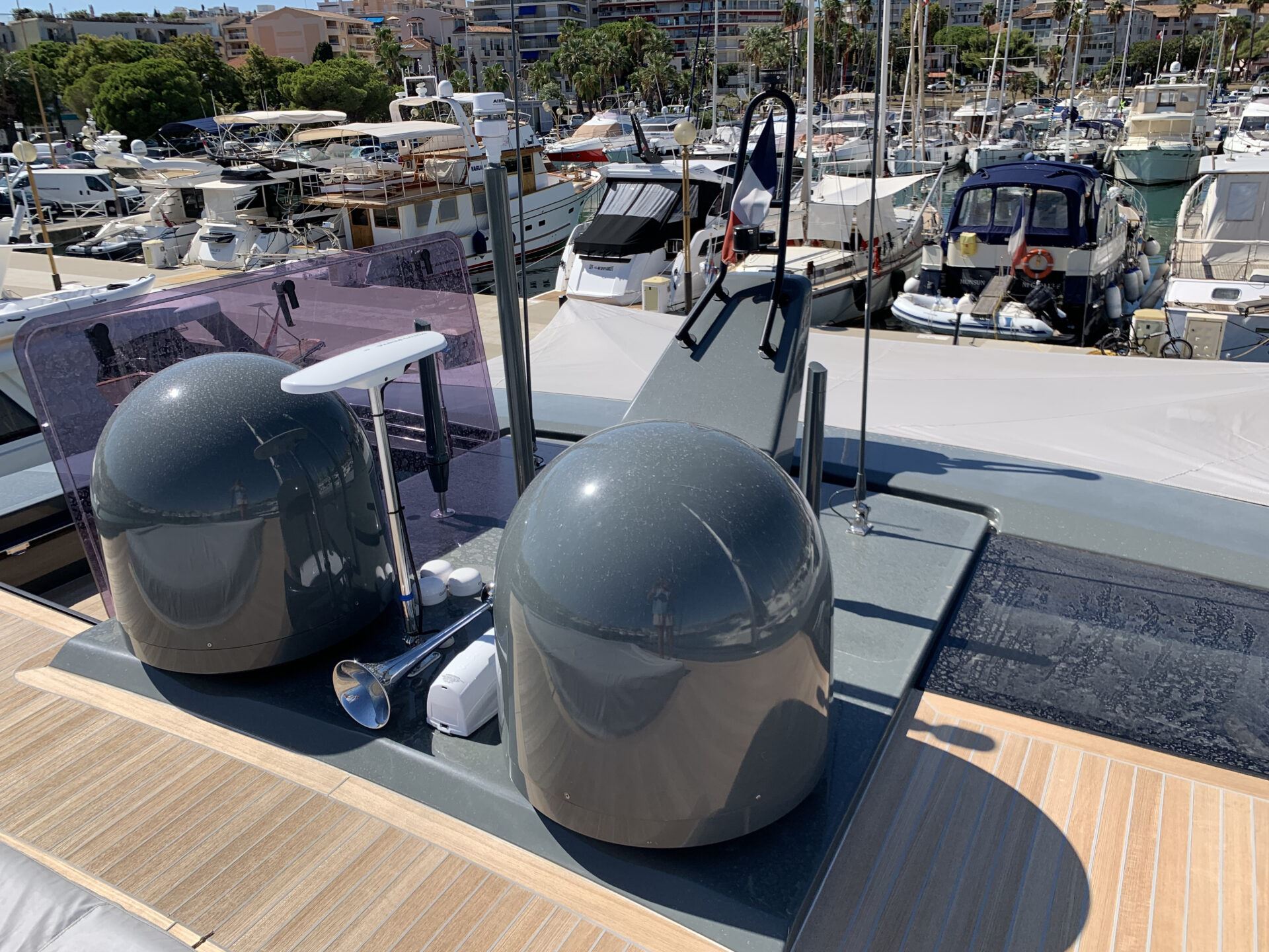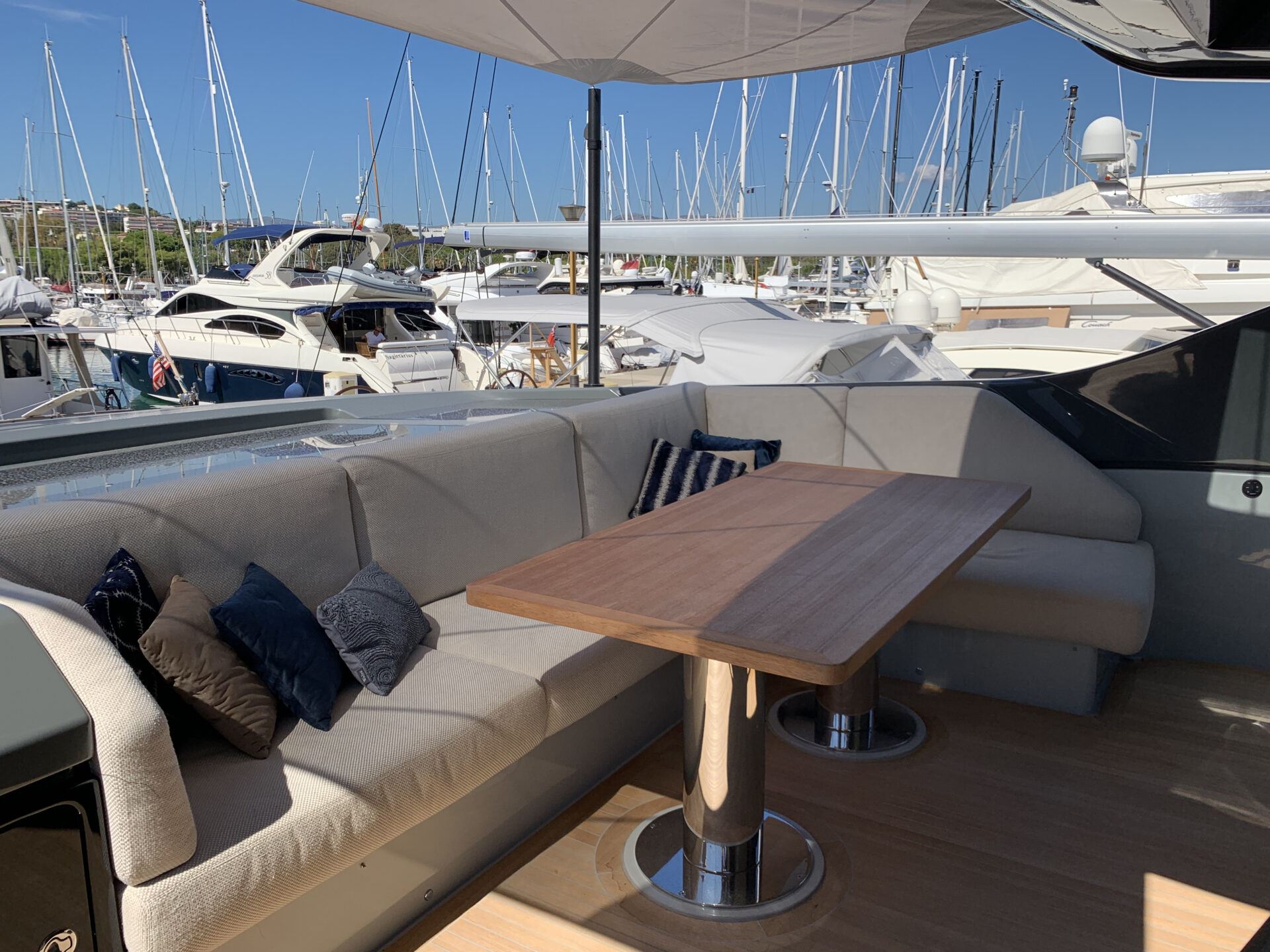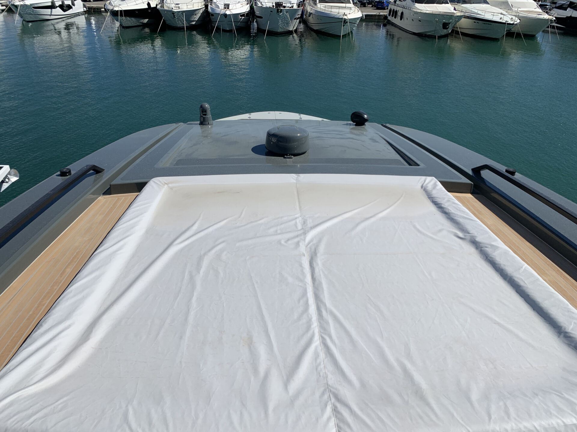 Her low profile, angular lines and sharp contours, as well as the windows tinted in the colour of the hull, give the boat its own character and distinct personality. The cockpit area features an L-shaped sofa with a table, and the foredeck presents a huge space with sofas, sun loungers and height-adjustable tables. Retractable awnings in the stern and bow cover these areas from the sun, creating a space for relaxing in the shade.