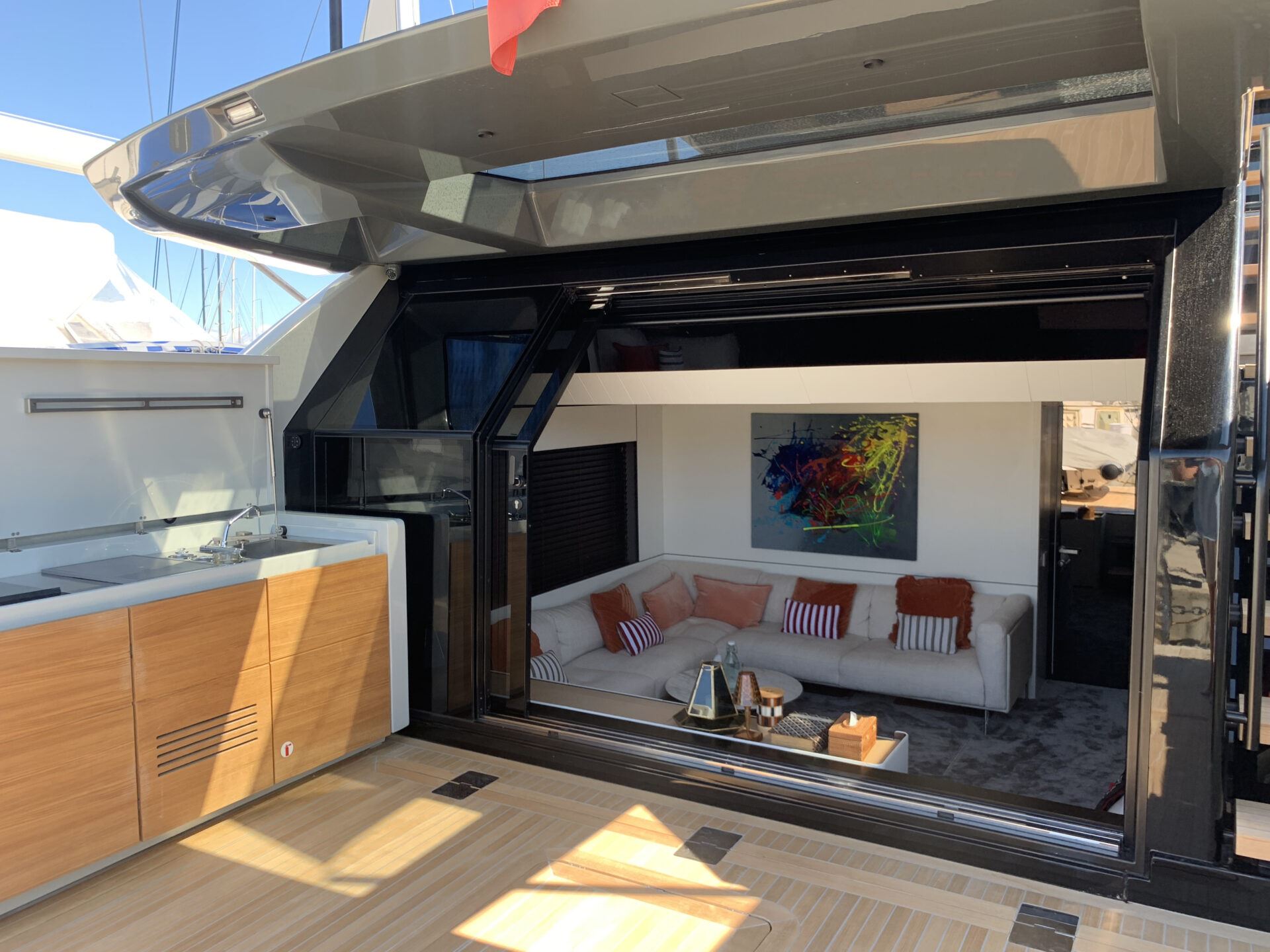On the main deck level there is a closed saloon organized in an open space and style. The control station is almost centrally located, the kitchen occupies the entire starboard side and there is a lounge/dining area with a stylish L-shaped sofa and dining table.