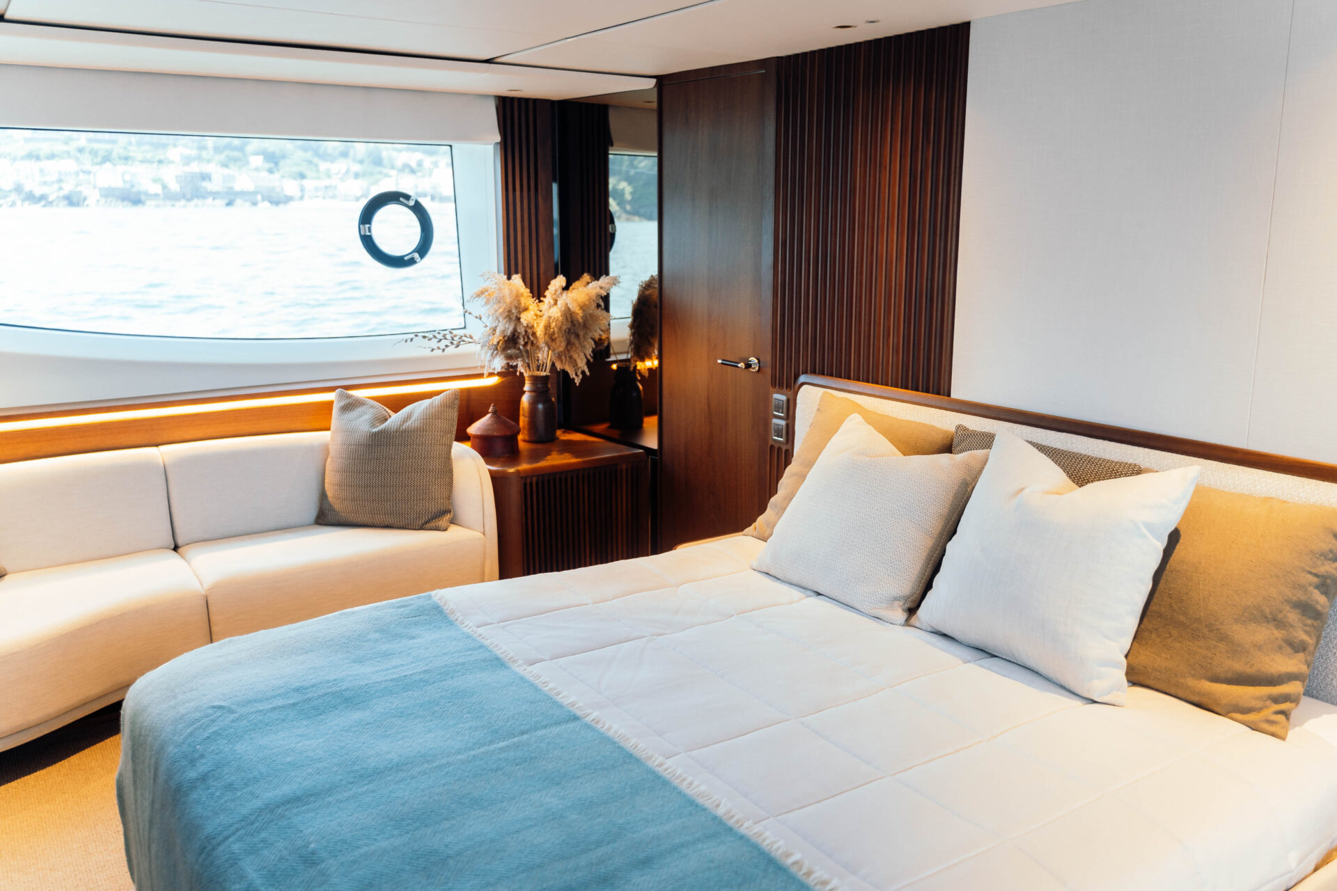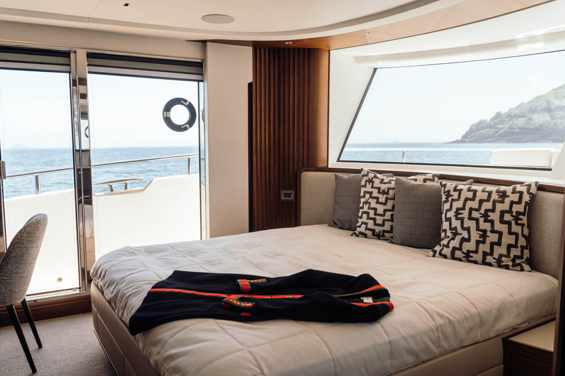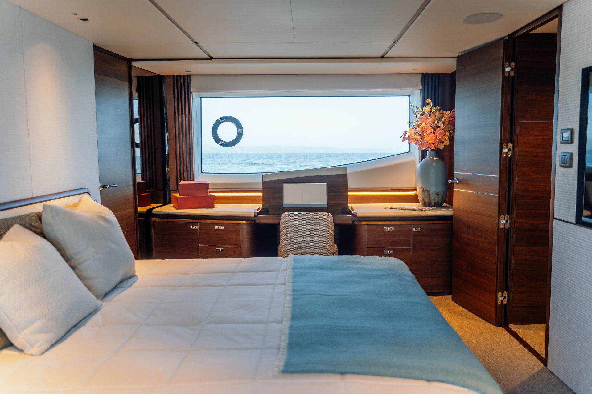Chase’s performance is equally persuasive. Twin MAN V12-1900 diesels unleash a combined 3,800 mhp, propelling the yacht to an exhilarating 31-knot top speed yet settling into a 25-knot cruise that uses only 498 litres per hour. Pair the optional 8,800-litre long-range tanks with Princess seakeeping and you truly have a winning combination. Sleipner Vector-Fin stabilisers calm the ride underway and at anchor, while proportional bow and stern thrusters plus a stern docking station make tight marinas a simple solo endeavour.
