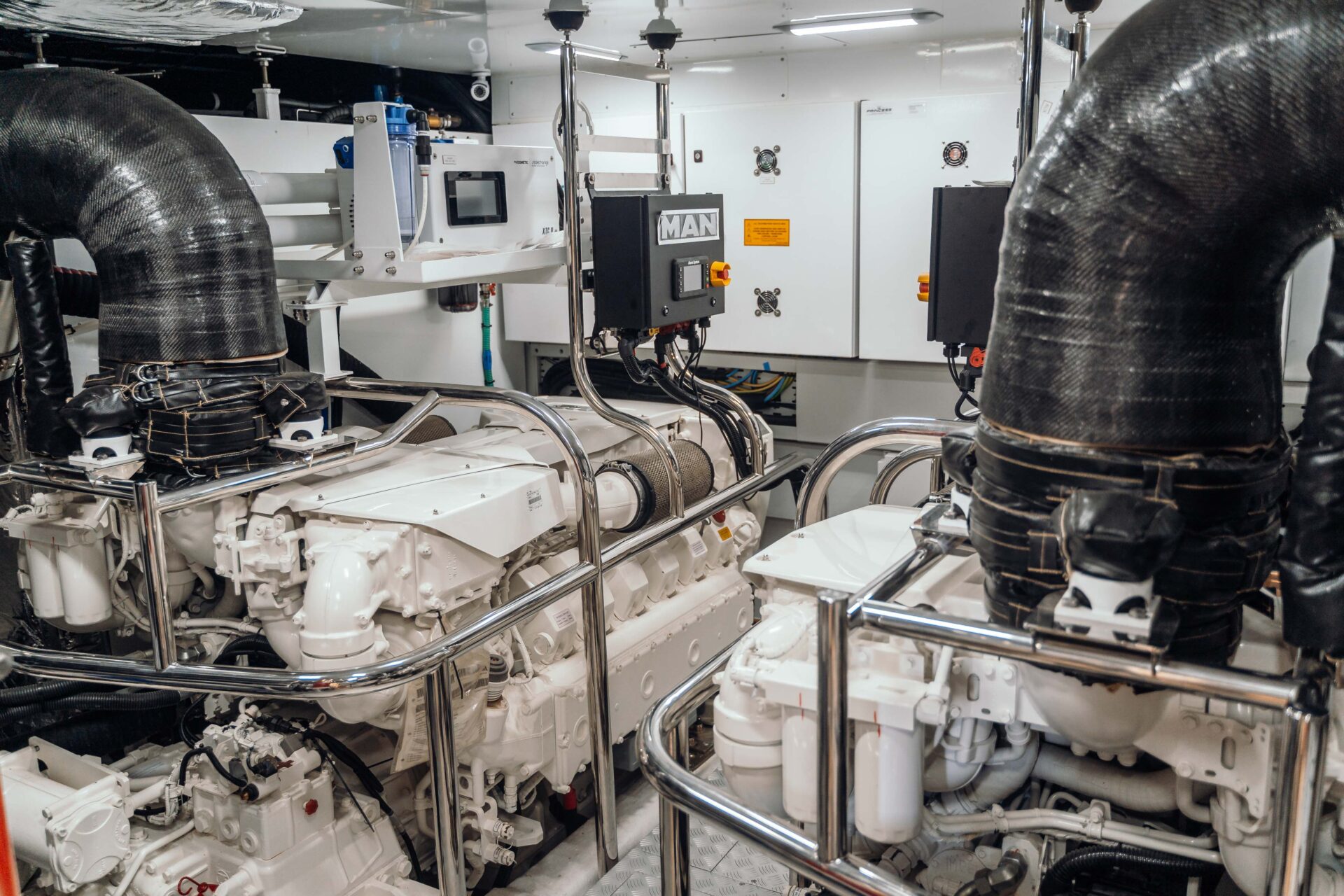 High-Performance Engineering: Powered by twin MAN V12-1900 engines delivering a top speed of 31 knots, with efficient cruising at 25 knots and optional 8,800-litre long-range tanks, combining speed, range, and fuel efficiency.