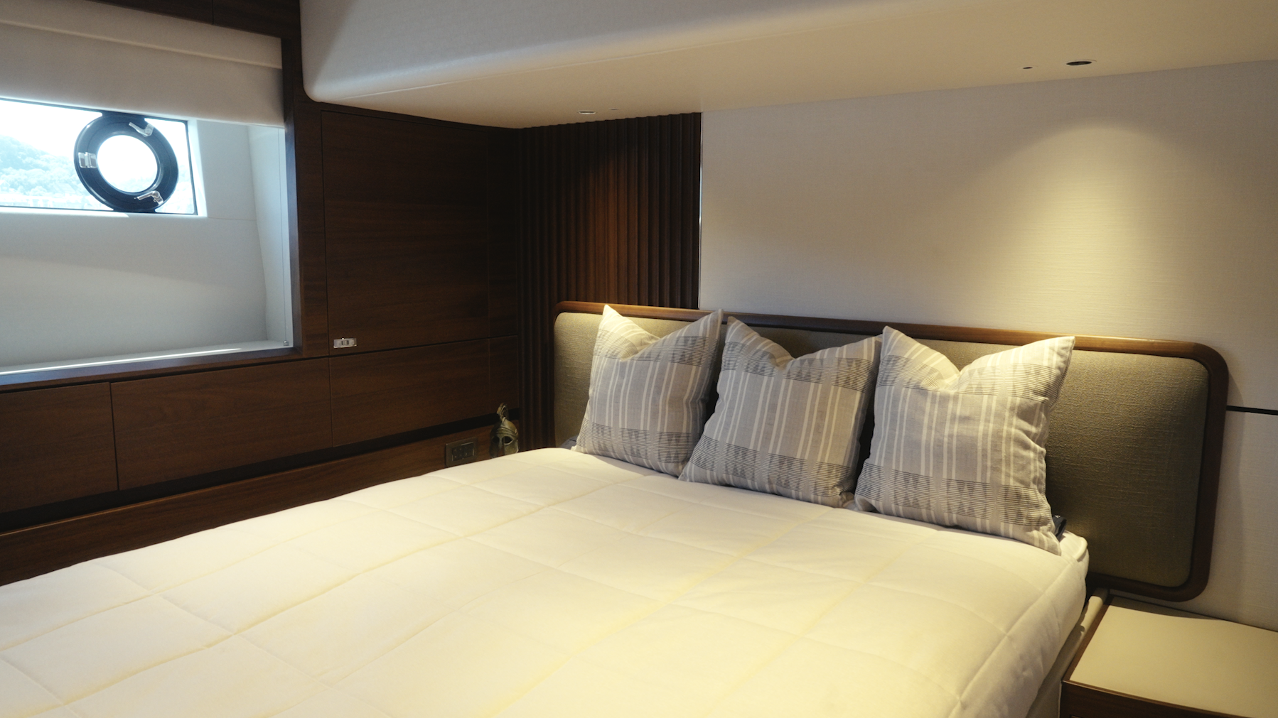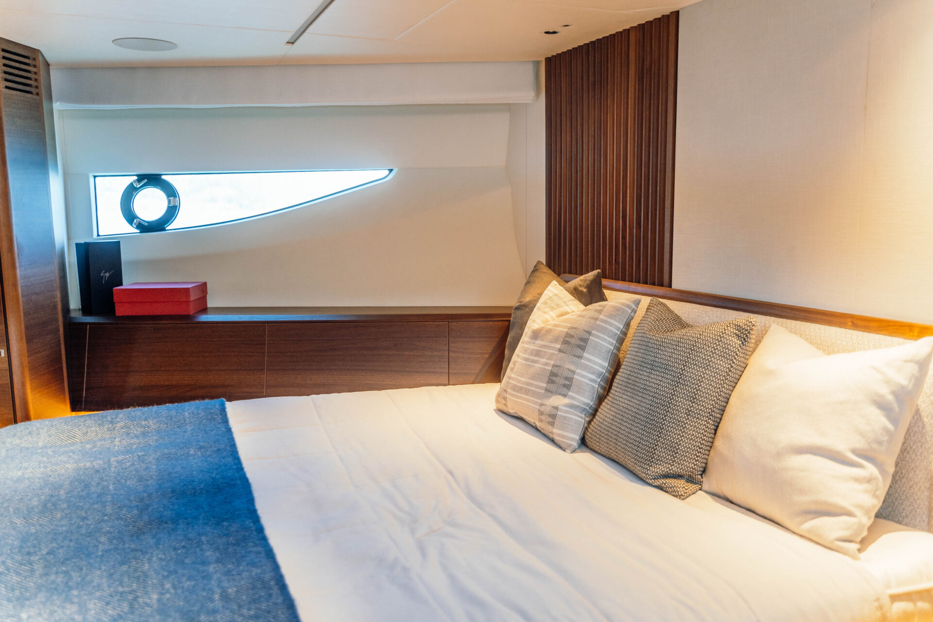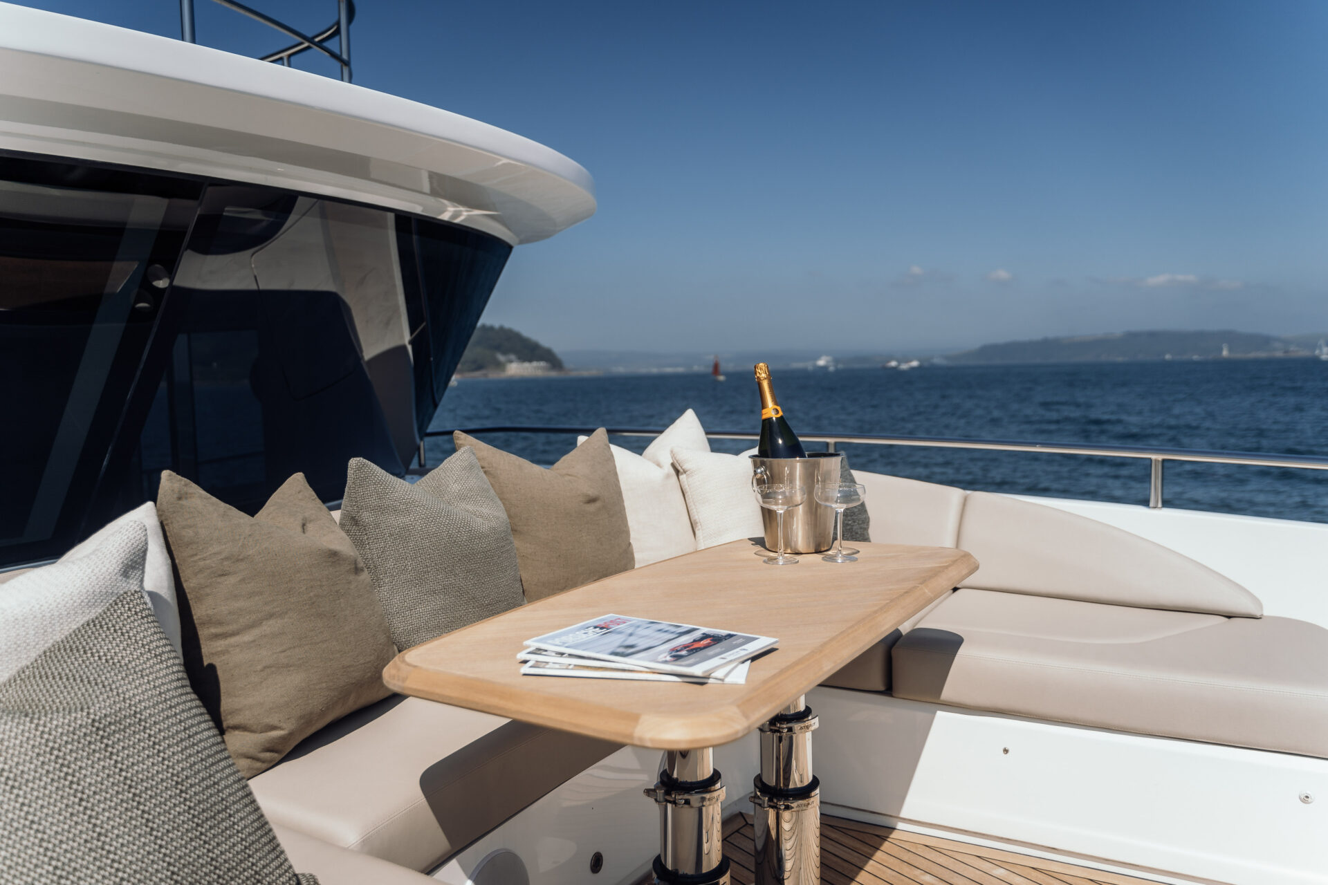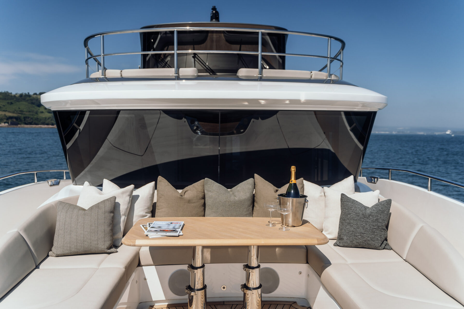 Advanced Stabilisation & Handling: Features Sleipner Vector-Fin stabilisers, bow and stern thrusters, and a stern docking station, ensuring smooth cruising and effortless marina handling.