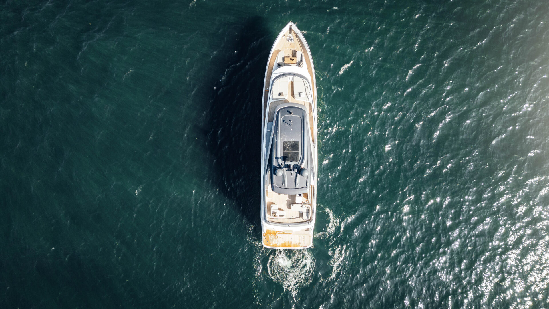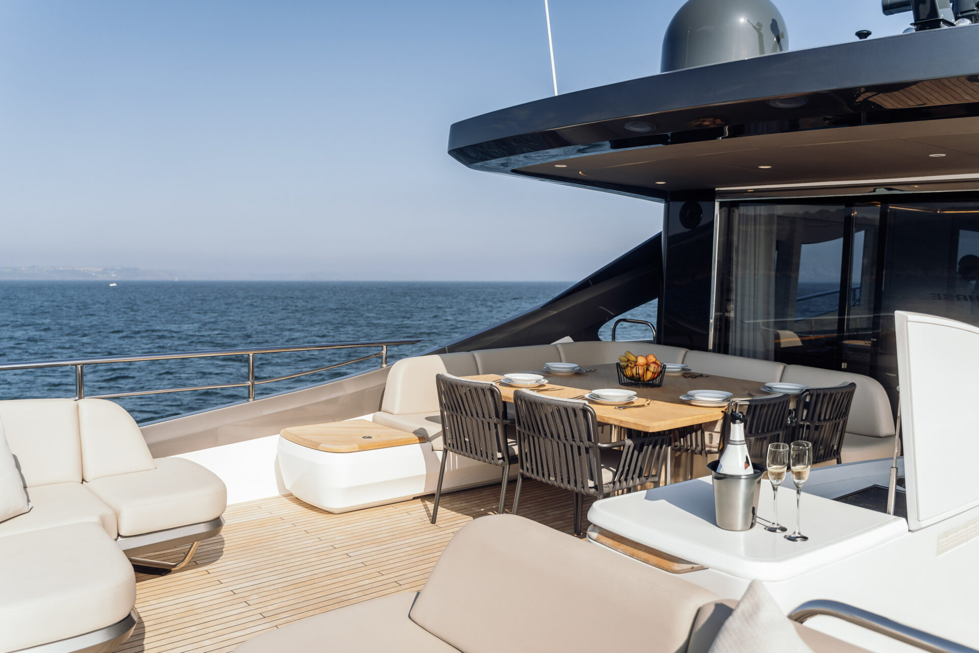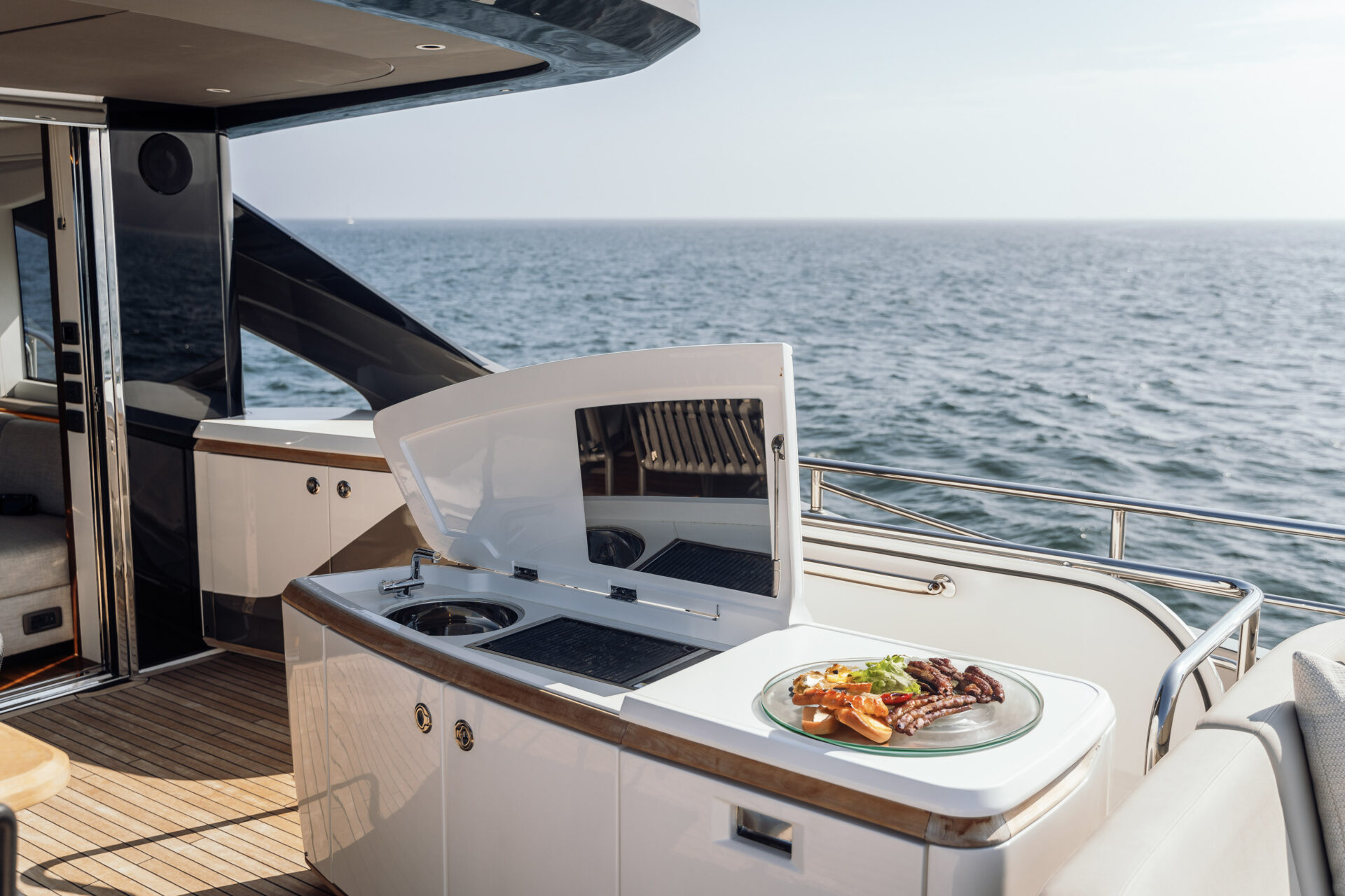 Outside living revolves around choice. Cockpit dining for ten lies just a few teak steps from the hydraulic beach-club platform and Seabob-ready lazarette. Up top, the Superfly offers a barbecue wet-bar, twin convertible loungers and an alfresco table for ten beneath a carbon-fibre sun-awning, all complemented by JL Audio sound and discreet mood lighting. Forward, large dual sunpads beckon for languid afternoons, and colour-changing underwater lights transform quiet anchorages into private light shows after dark.