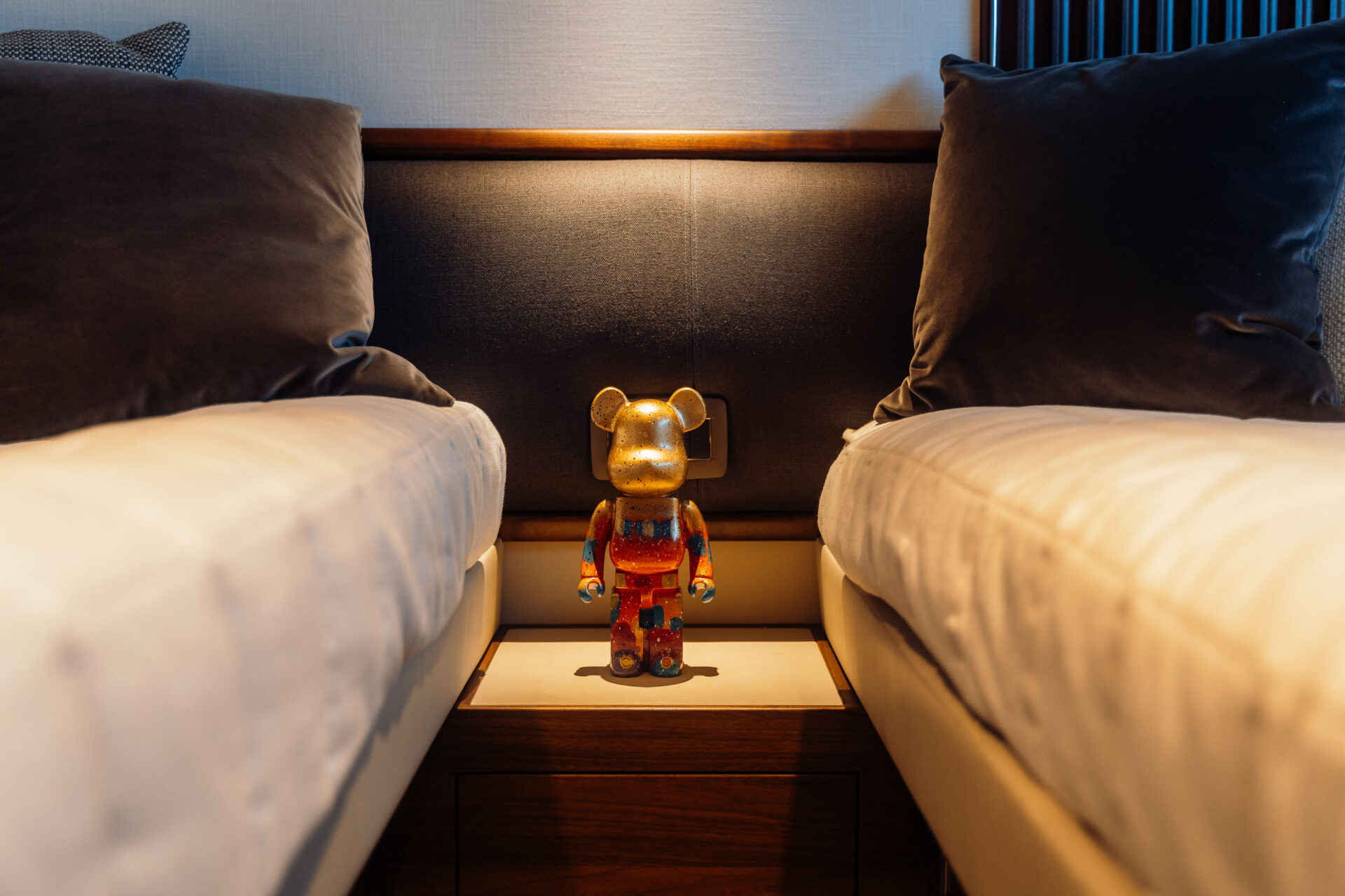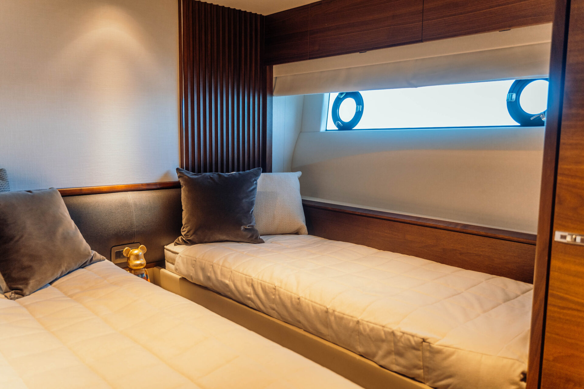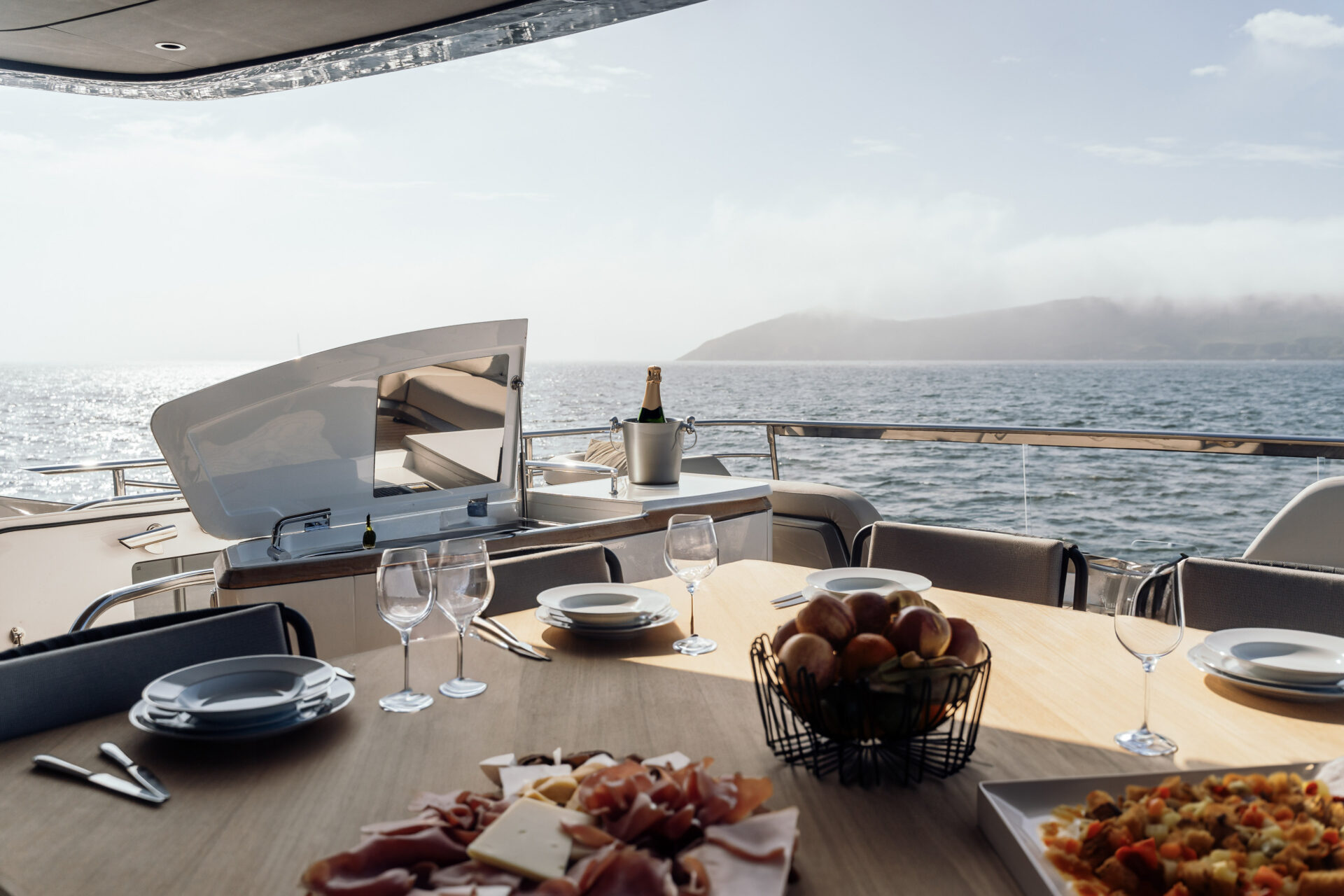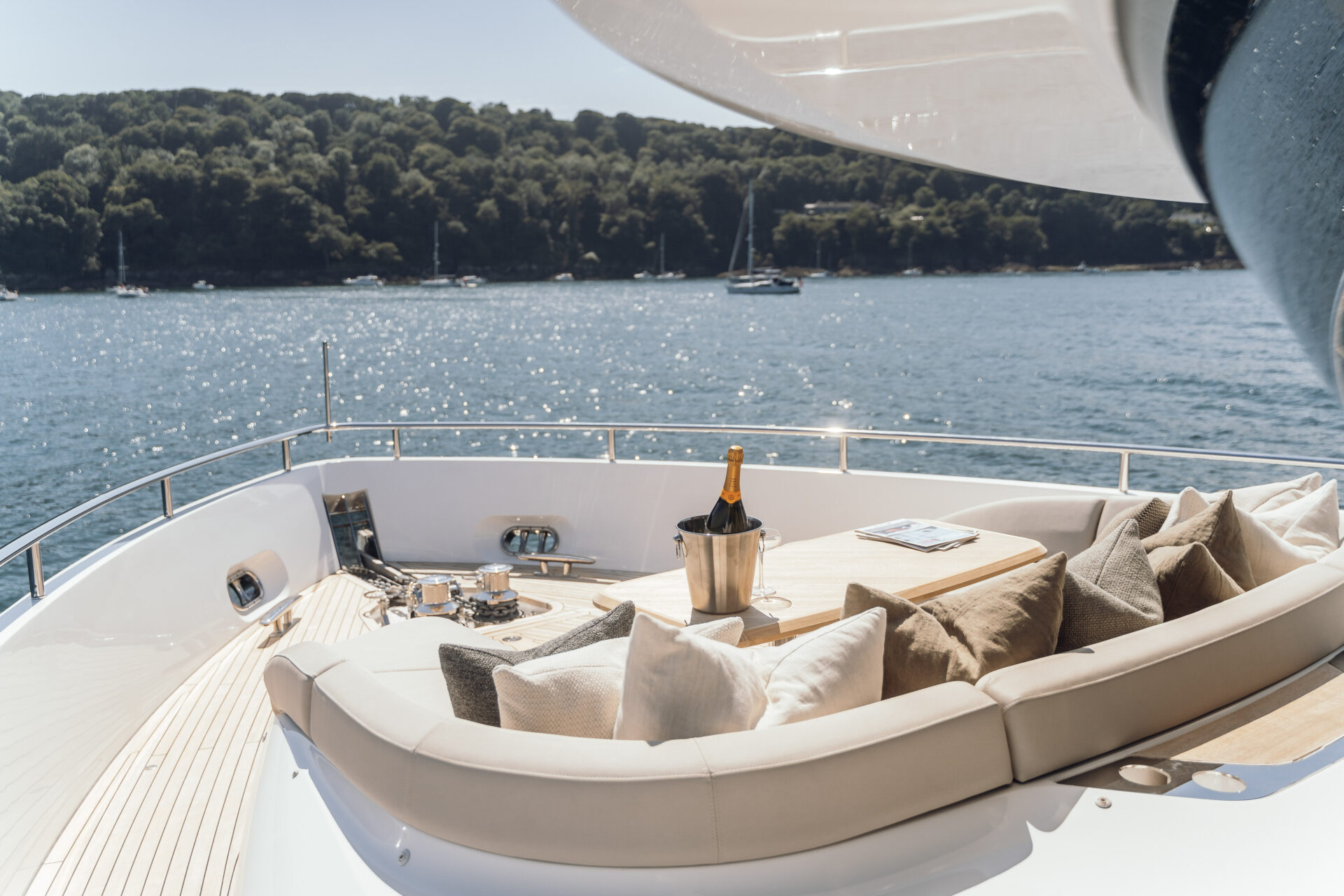 Outside living revolves around choice. Cockpit dining for ten lies just a few teak steps from the hydraulic beach-club platform and Seabob-ready lazarette. Up top, the Superfly offers a barbecue wet-bar, twin convertible loungers and an alfresco table for ten beneath a carbon-fibre sun-awning, all complemented by JL Audio sound and discreet mood lighting. Forward, large dual sunpads beckon for languid afternoons, and colour-changing underwater lights transform quiet anchorages into private light shows after dark.