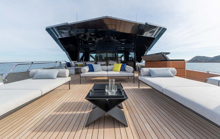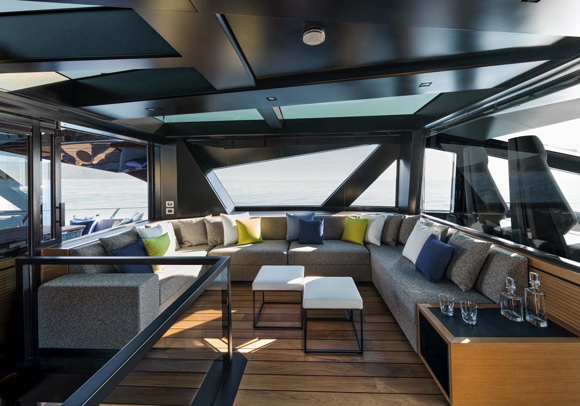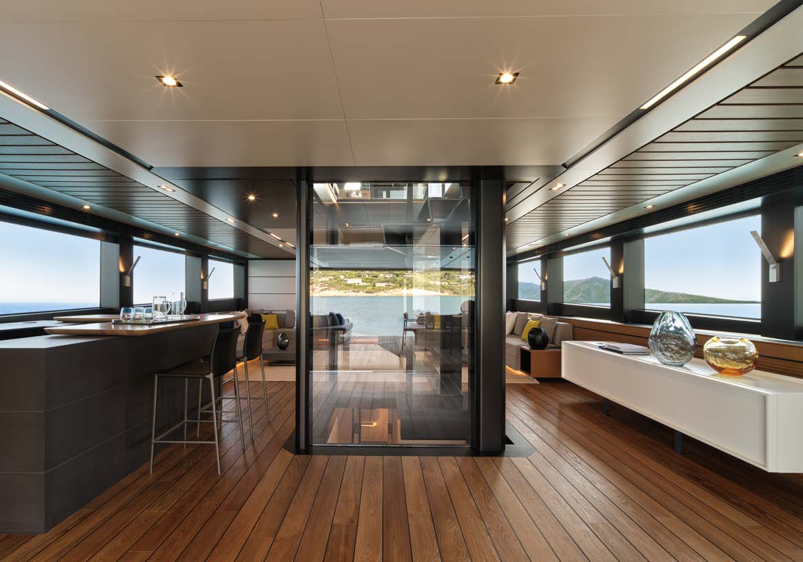 The interiors of wallywhy200 reflect the Wally DNA to combine classic and contemporary elements with a functional design, where simplicity is the result of high ingenuity typical of the brand. Additionally, they harmoniously dialogue with the exteriors creating the blend of the Wally inside-outside living. The use of the latest technologies throughout the yacht provides many lifestyle benefits. The wrap-around main deck in glass unlocks game-changing extra interior volume on this deck. The central carbon fiber staircase connecting the three decks performs as a structural element replacing the bulkheads to offer an open-plan contemporary living area. wallywhy200 was developed by Wally’s design team headed by Luca Bassani and the Ferretti Group Engineering Department, who worked with Laurent Giles NA Ltd for the naval architecture and Studio A. Vallicelli & Co for interior design.