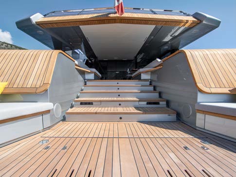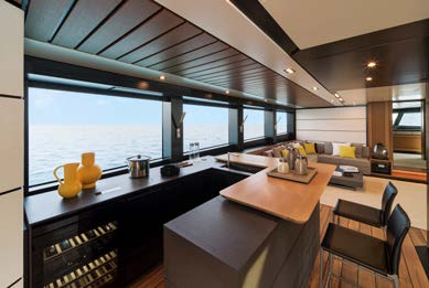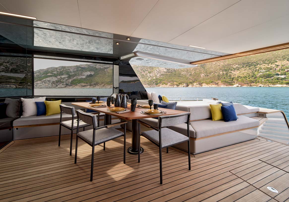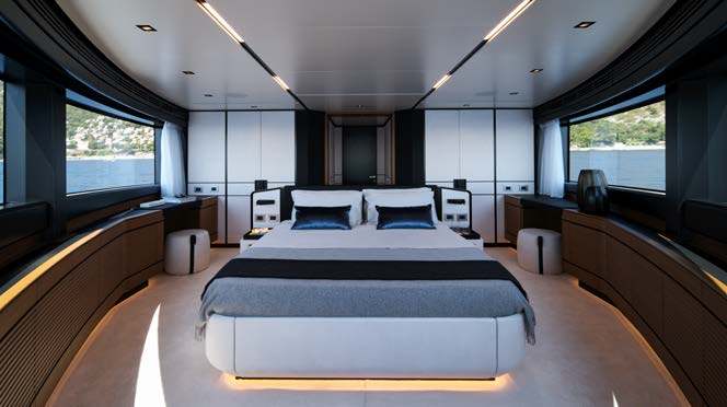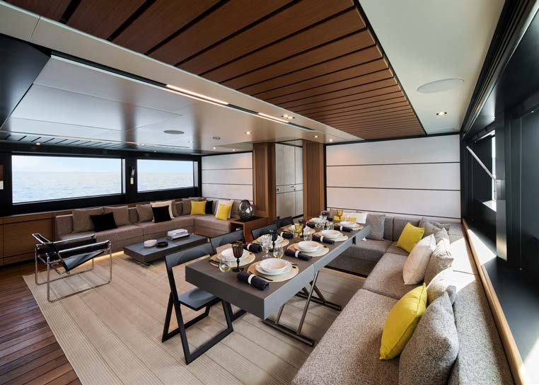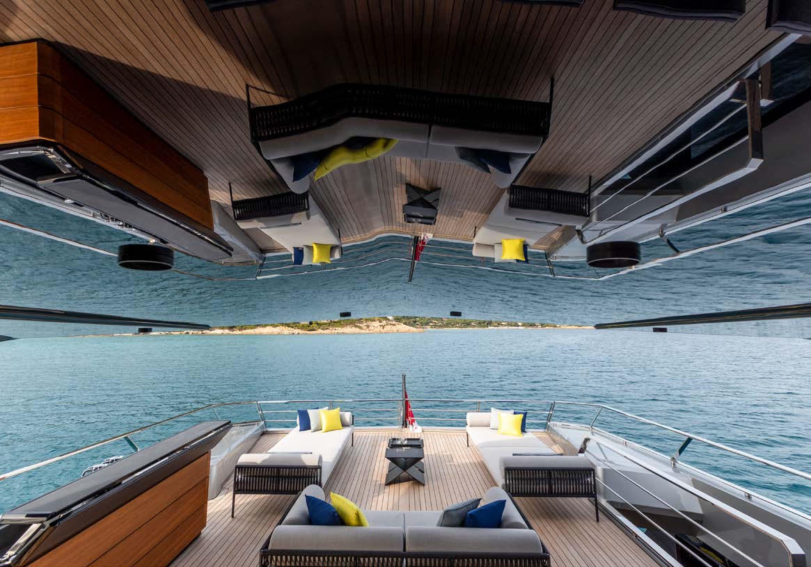 The innovative full-wide-body design indeed pushes design boundaries: measuring less than 24m loadline, wallywhy200 is rewriting the rules to make volume the most important gauge of a yacht. The numbers speak for themselves in showing why this yacht is so remarkable. The wallywhy200 provides more than 200 square meters (2,153 square feet) of indoor living space over three decks, and 144 sqm (1,550 sqft) of outdoor living. The beamy, trail-blazing and highly performing hull has been specifically developed for this semi-displacement yacht and tested in naval tank to optimise efficiency while cutting through the waves with no slamming and minimal pitching, like all Wally hulls. The wide beam combined with the zero-speed fin stabilisers and optional twin Seakeeper gyros ensure stability under way and at anchor. As one of the foundations for the wallywhy200 design concept, its Volvo pod propulsion system is central to delivering an engine room that maximizes living space on the lower deck, while also providingeasy and safe maneuvering from the helm.